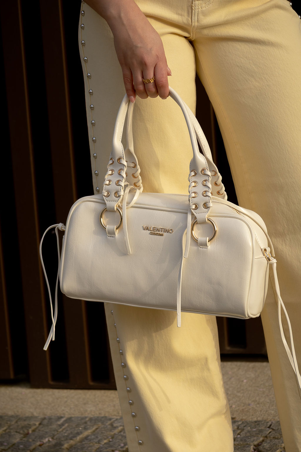 Na parte frontal destaca-se o logótipo metálico Valentino Creations em dourado, que acrescenta identidade e um toque refinado ao design. As duas alças de mão estruturadas são valorizadas por um detalhe decorativo com ilhós metálicos dourados e efeito entrelaçado, criando um elemento distintivo que eleva o visual da peça.
