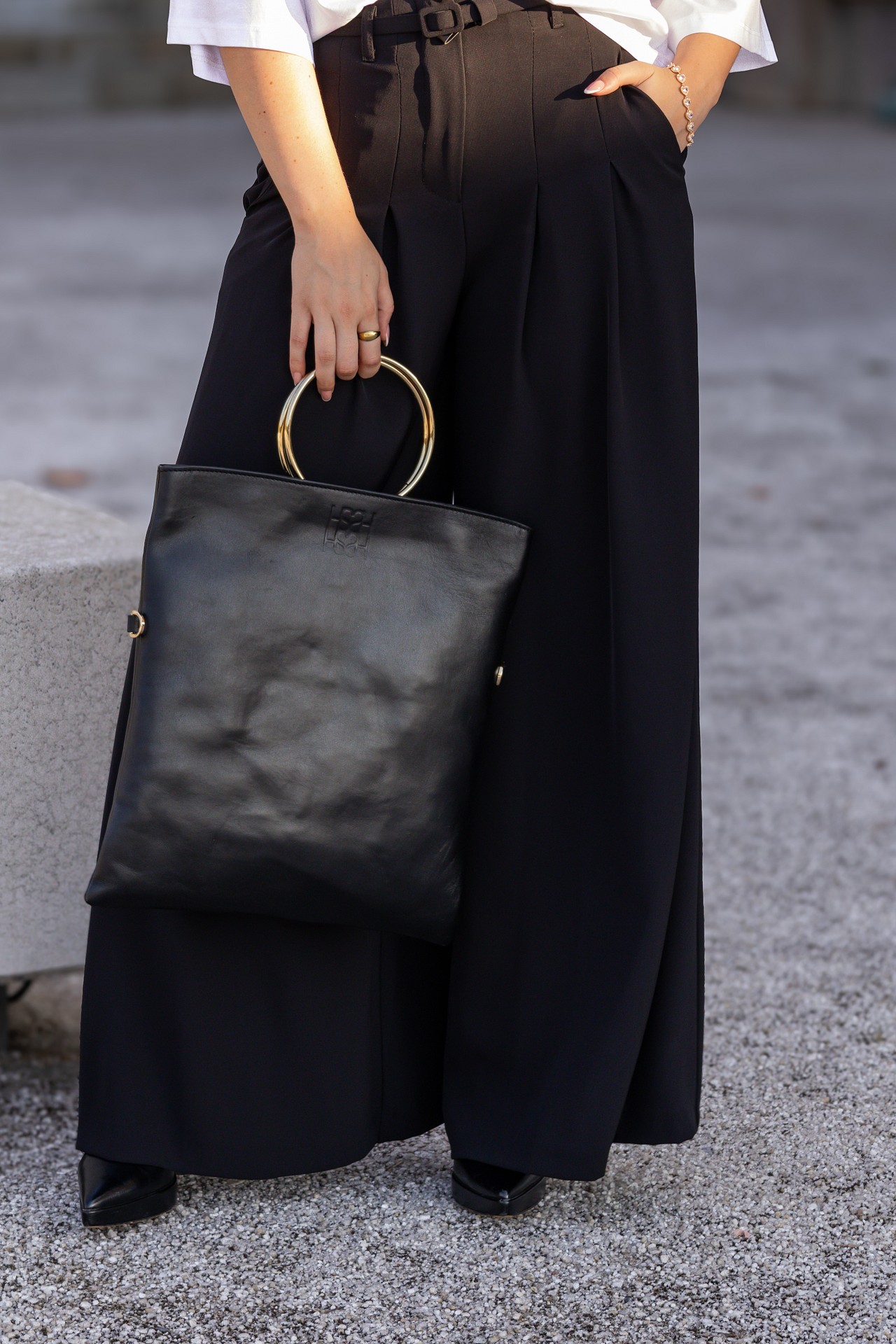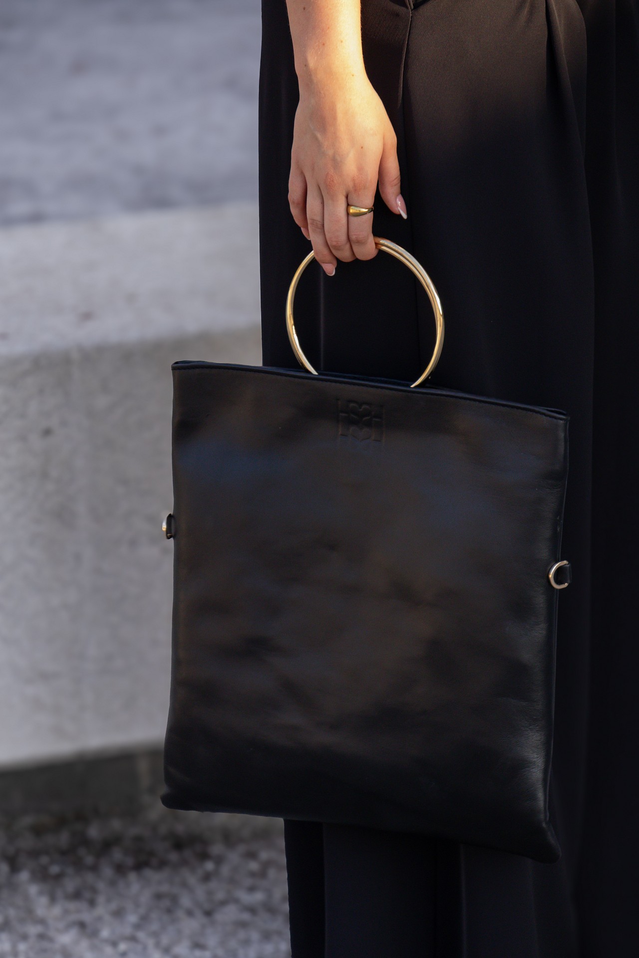 O destaque vai para a argola metálica dourada, que serve de alça e detalhe decorativo, acrescentando modernidade e requinte à silhueta minimalista. O formato estruturado torna esta mala prática e versátil, perfeita para acompanhar coordenados de trabalho, eventos ou looks de fim de semana com igual elegância.