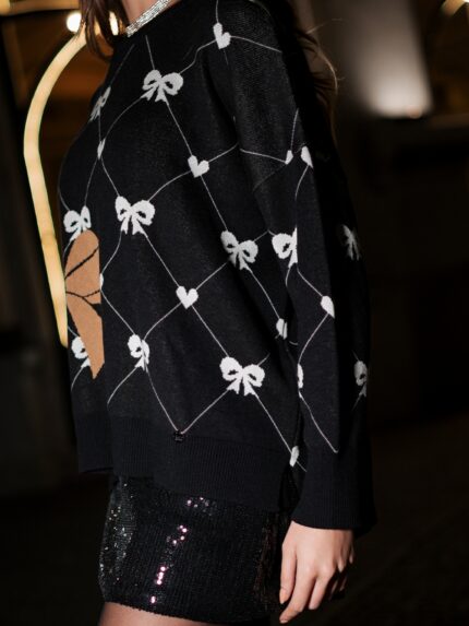 As estrelas prateadas em lurex distribuem-se pela peça com equilíbrio, criando um contraste elegante com o fundo escuro. As riscas nas mangas, também em brilho metálico, acrescentam dinamismo e reforçam o estilo contemporâneo que define esta malha. A silhueta ampla, confortável e descontraída garante um fitting impecável e uma versatilidade que se adapta tanto a looks festivos como a coordenados urbanos do dia a dia.