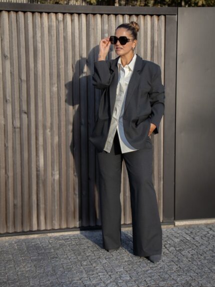 Pantalona com prega na frente. Bolsos laterais. Abotoa na frente com carcela de fecho e guto. Compsoição: 88% Poliéster 12% Elastano