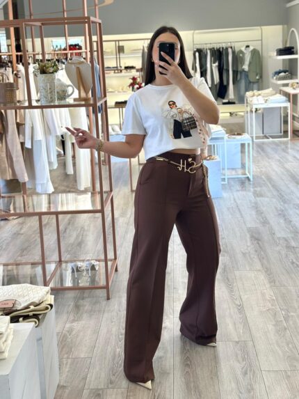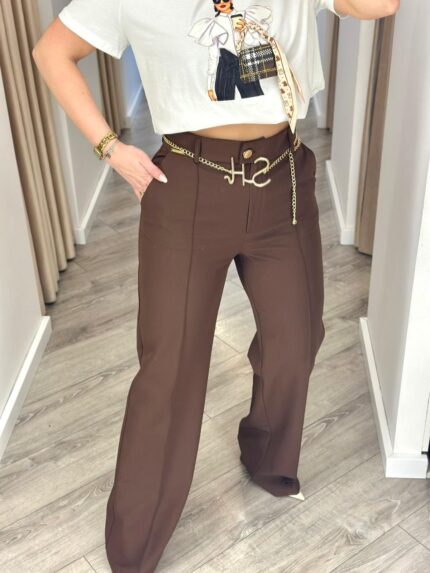 CALÇA CASTANHA WIDE LEG COM NERVURA FRONTAL SAHOCO