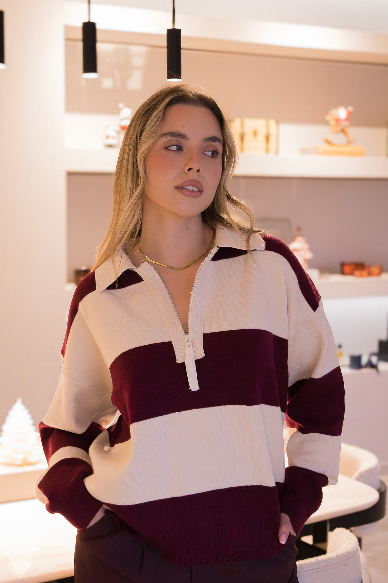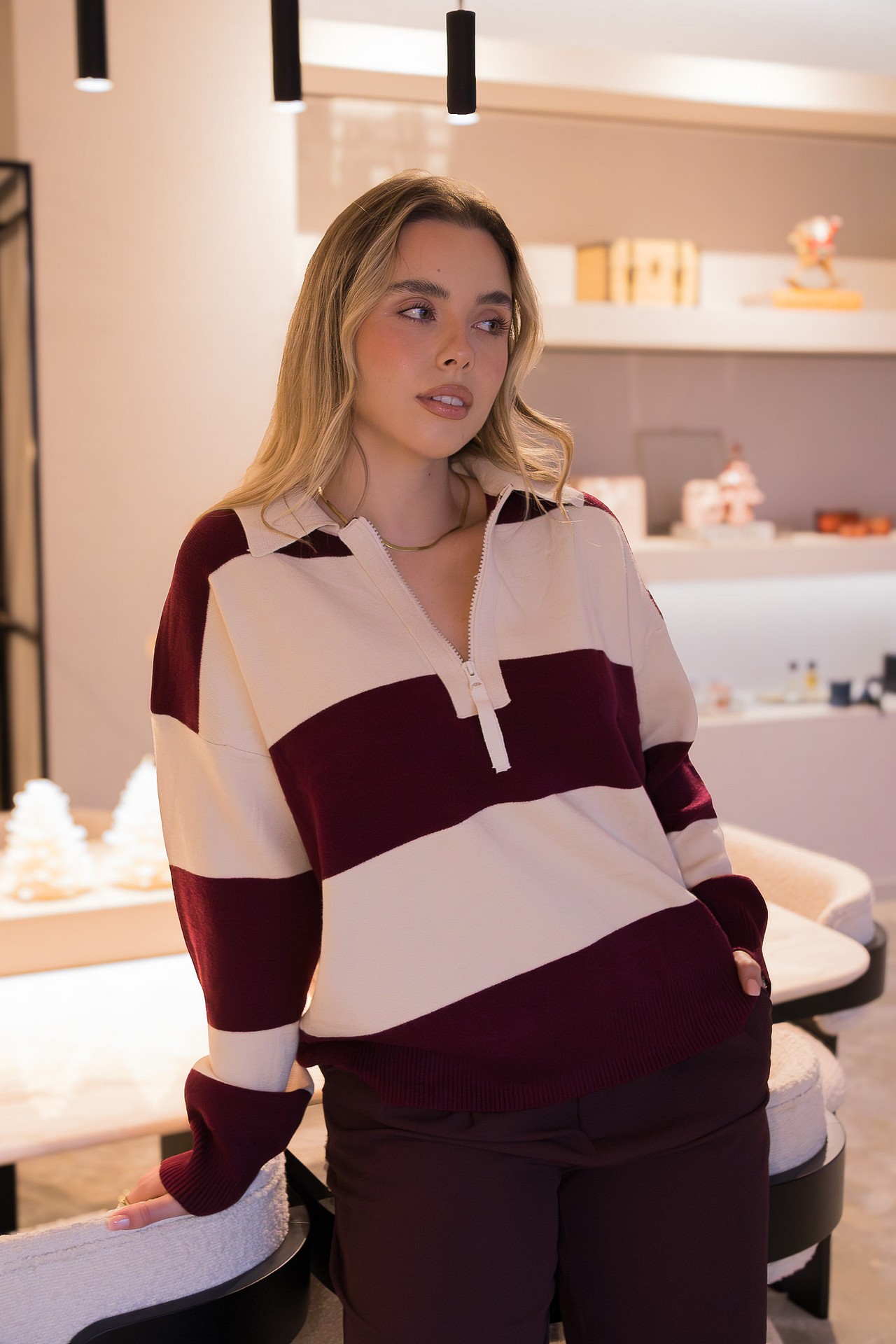 Versátil e atual, o pólo bordo e cru Ponto Chic combina facilmente com jeans, calças de alfaiataria ou saias estruturadas, permitindo criar coordenados casuais, elegantes ou mesmo mais descontraídos, sempre com um toque de estilo intencional.