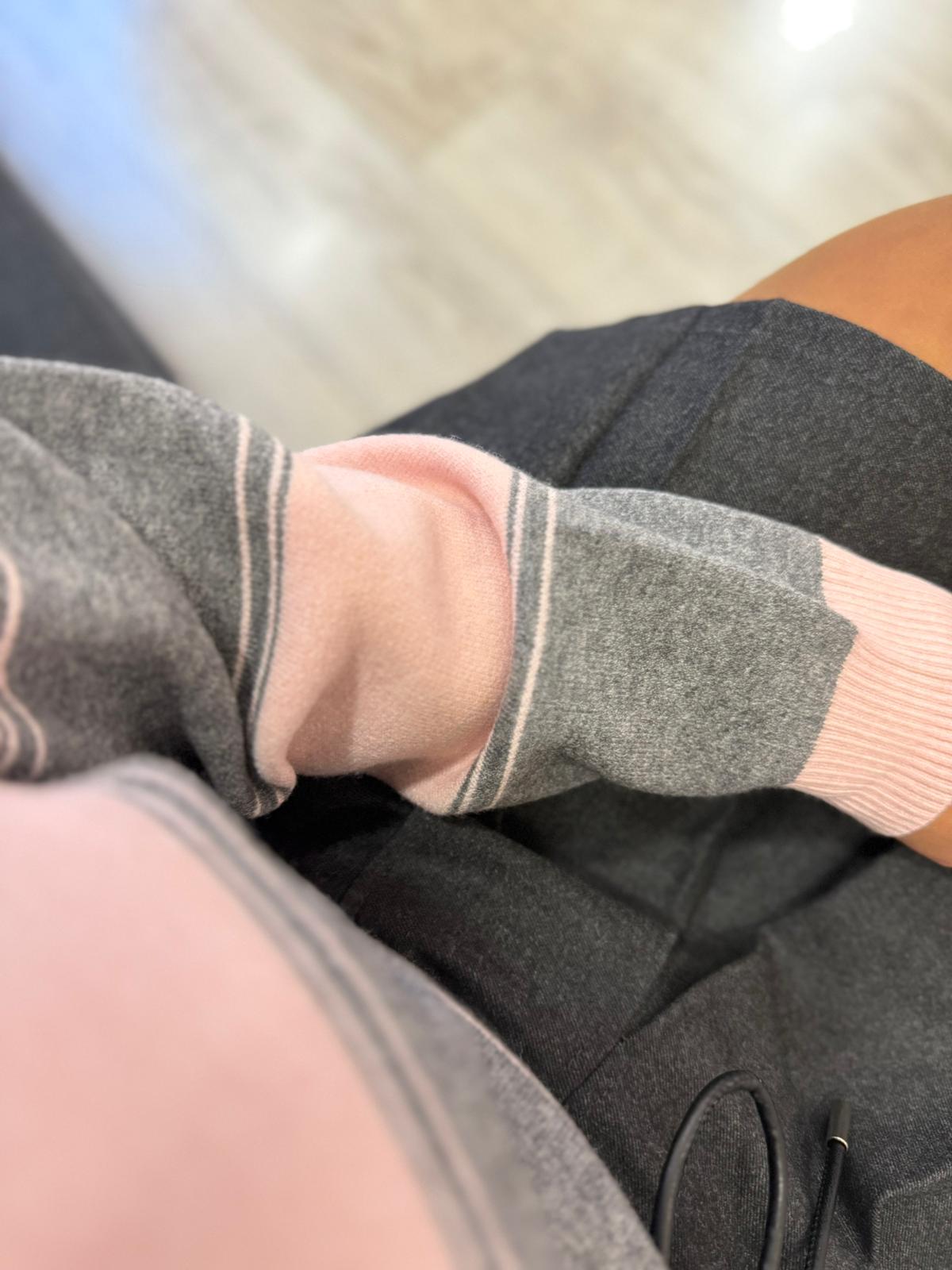 Versátil e fácil de coordenar, o polo cinza e rosa com decote em V Ponto Chic adapta-se tanto a looks casuais como a combinações mais arrumadas, tornando-se uma escolha prática e estilosa para qualquer guarda-roupa.