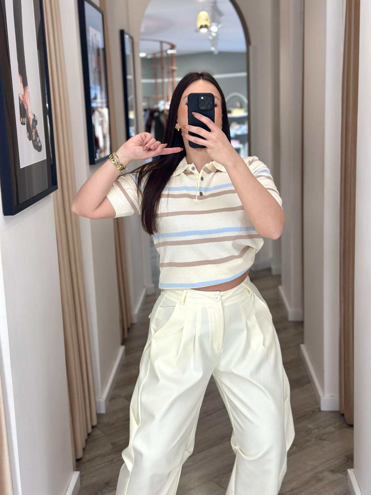 A gola polo estruturada e o fecho frontal com botões discretos conferem um visual clássico e sofisticado, reinterpretado de forma moderna através da malha fina e do padrão de riscas delicadas. As mangas curtas e o corte reto garantem conforto e versatilidade, tornando esta peça perfeita para looks de primavera verão e transições de estação. A base canelada proporciona um acabamento elegante e um encaixe harmonioso na silhueta, permitindo conjugações fáceis com calças de alfaiataria, jeans, saias ou peças mais fluidas.