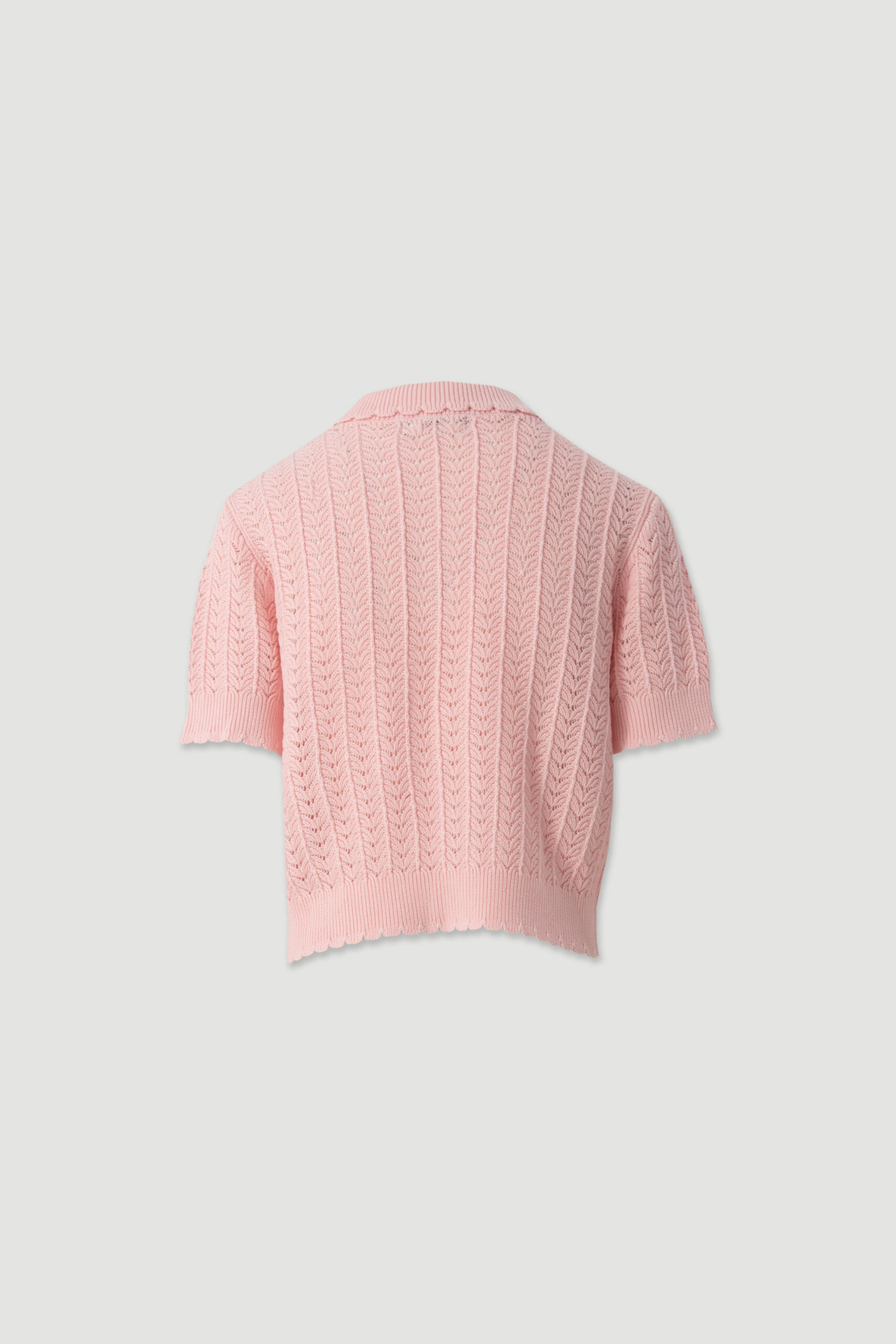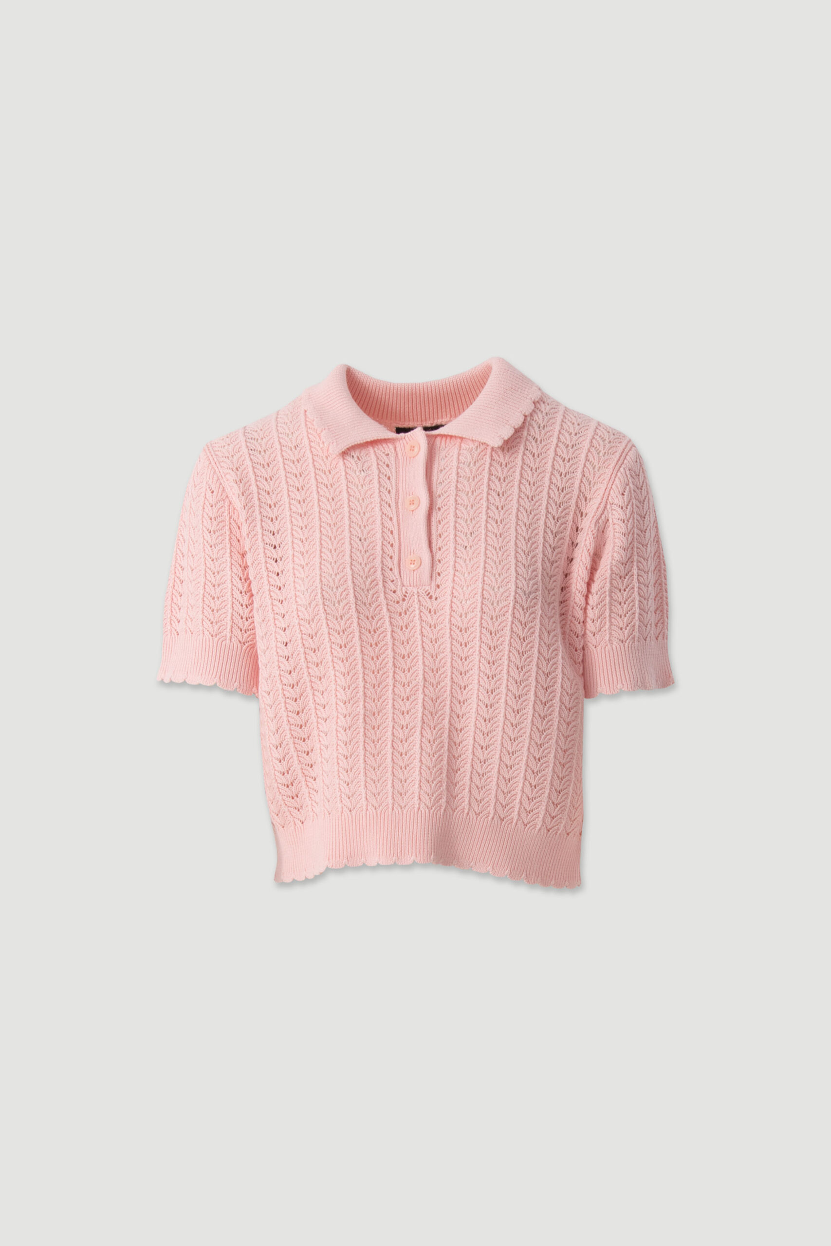 O modelo combina a elegância clássica do colarinho polo com um trabalho de malha detalhado, criando um efeito visual rico e diferenciador. O fecho com botões frontais reforça o carácter intemporal da peça, enquanto o corte ajustado valoriza a silhueta de forma subtil.