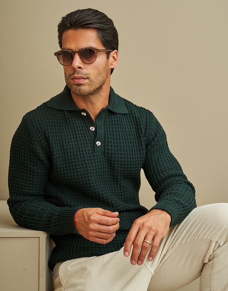 Versátil e de tom profundamente elegante, o Pólo de Tricô Estruturado Verde-Escuro Zolf adapta-se facilmente a looks casuais ou mais cuidados, sendo uma escolha segura para quem procura um essencial moderno, confortável e com um toque premium no guarda-roupa.