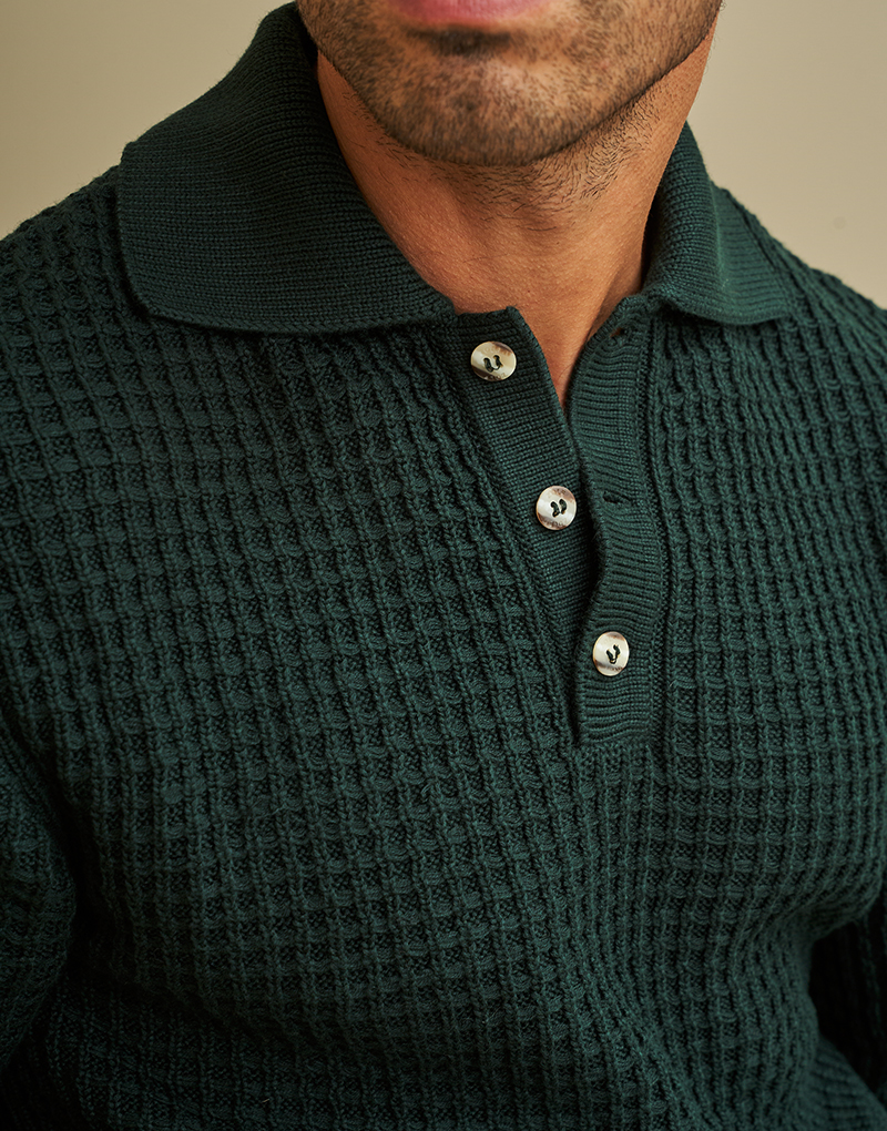 O pólo de tricô estruturado verde-escuro da Zolf mantém o mesmo equilíbrio premium entre conforto, elegância e modernidade. Produzido em 50% algodão e 50% modal, oferece um toque suave, respirável e muito confortável, ideal para o uso diário. A malha estruturada em padrão waffle acrescenta textura e profundidade, criando um visual contemporâneo que eleva qualquer coordenado.