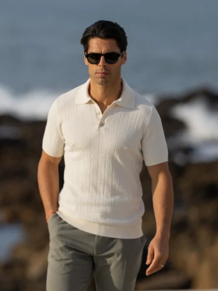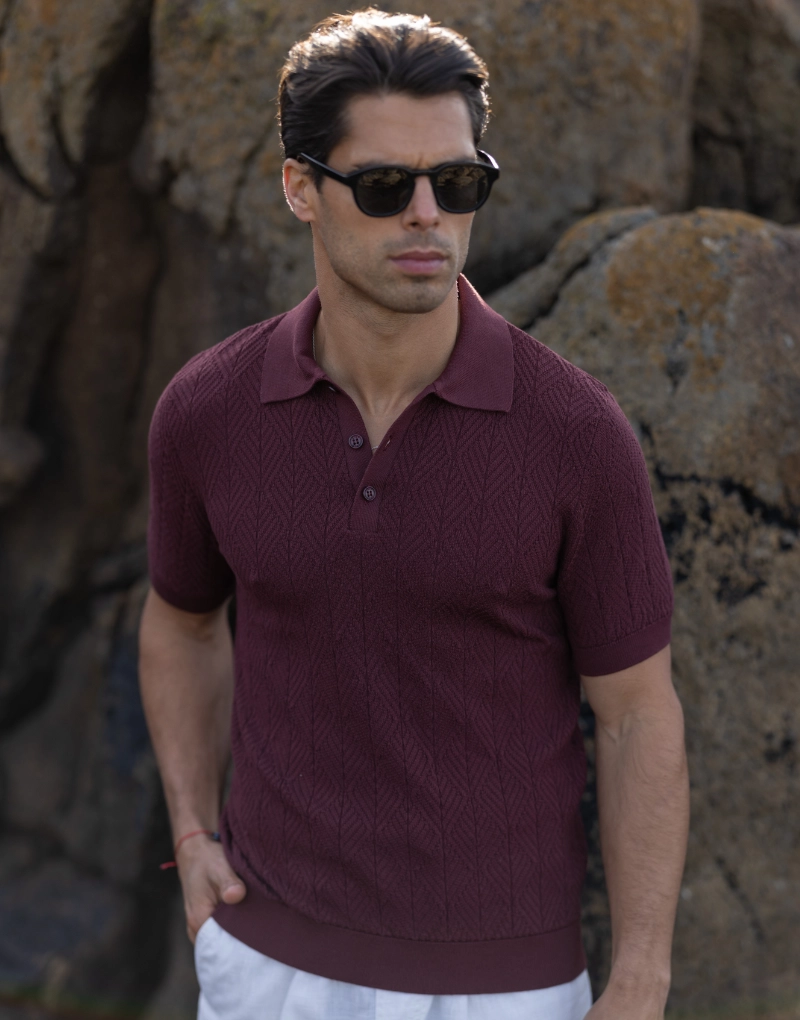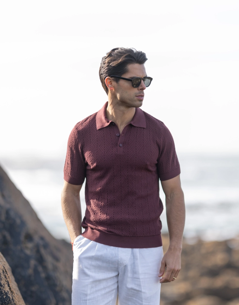 Polo em malha tricotada estruturada num sofisticado tom borgonha, que combina profundidade de cor com conforto absoluto. A composição em 100% algodão garante um toque suave e respirável, ideal para o dia a dia com um acabamento premium.