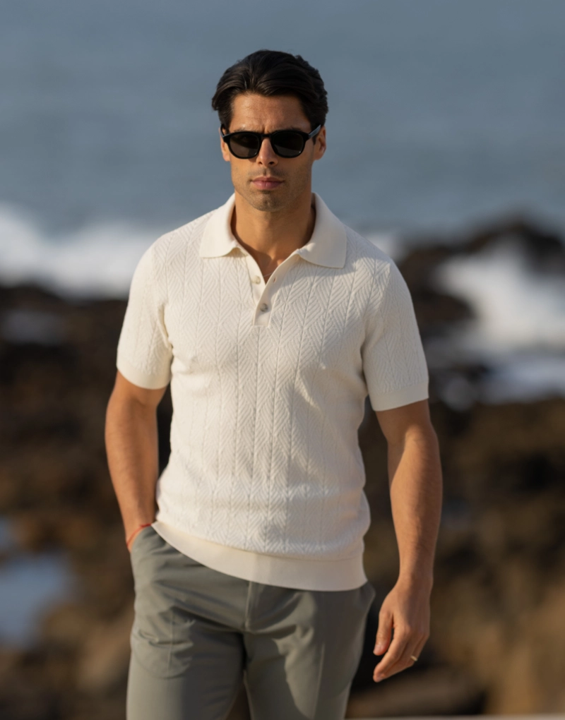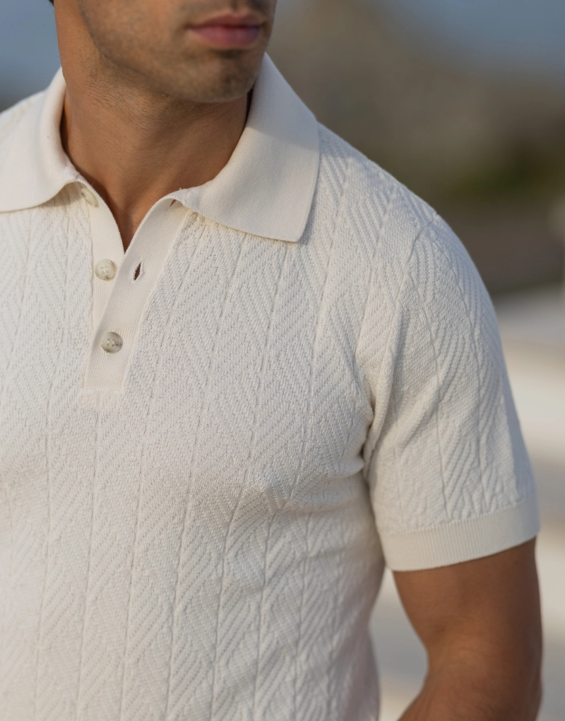 Polo em malha tricotada estruturada num elegante tom cru, que combina sofisticação com conforto. A composição em 100% algodão confere-lhe um toque suave e respirável, ideal para o dia a dia com um acabamento cuidado e premium.