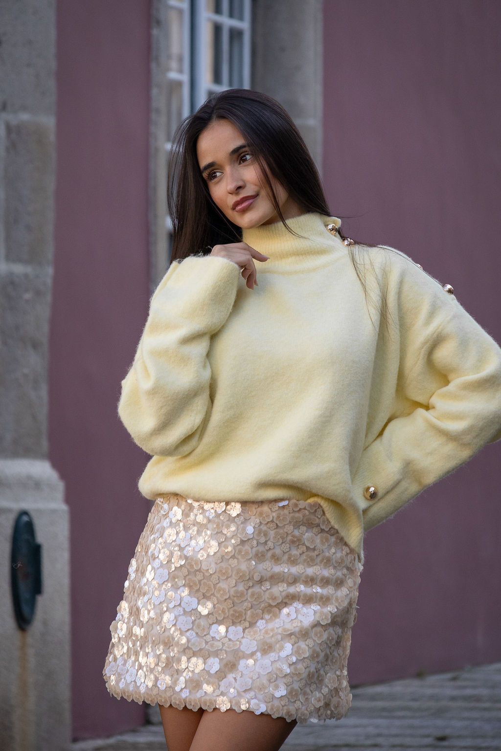 Elegante e impactante, esta saia em tom bege destaca-se pela aplicação integral de lantejoulas com padrão floral, criando um efeito luminoso sofisticado e feminino. Confeccionada em 100% poliéster, combina leveza com estrutura, garantindo conforto e um visual cuidado.