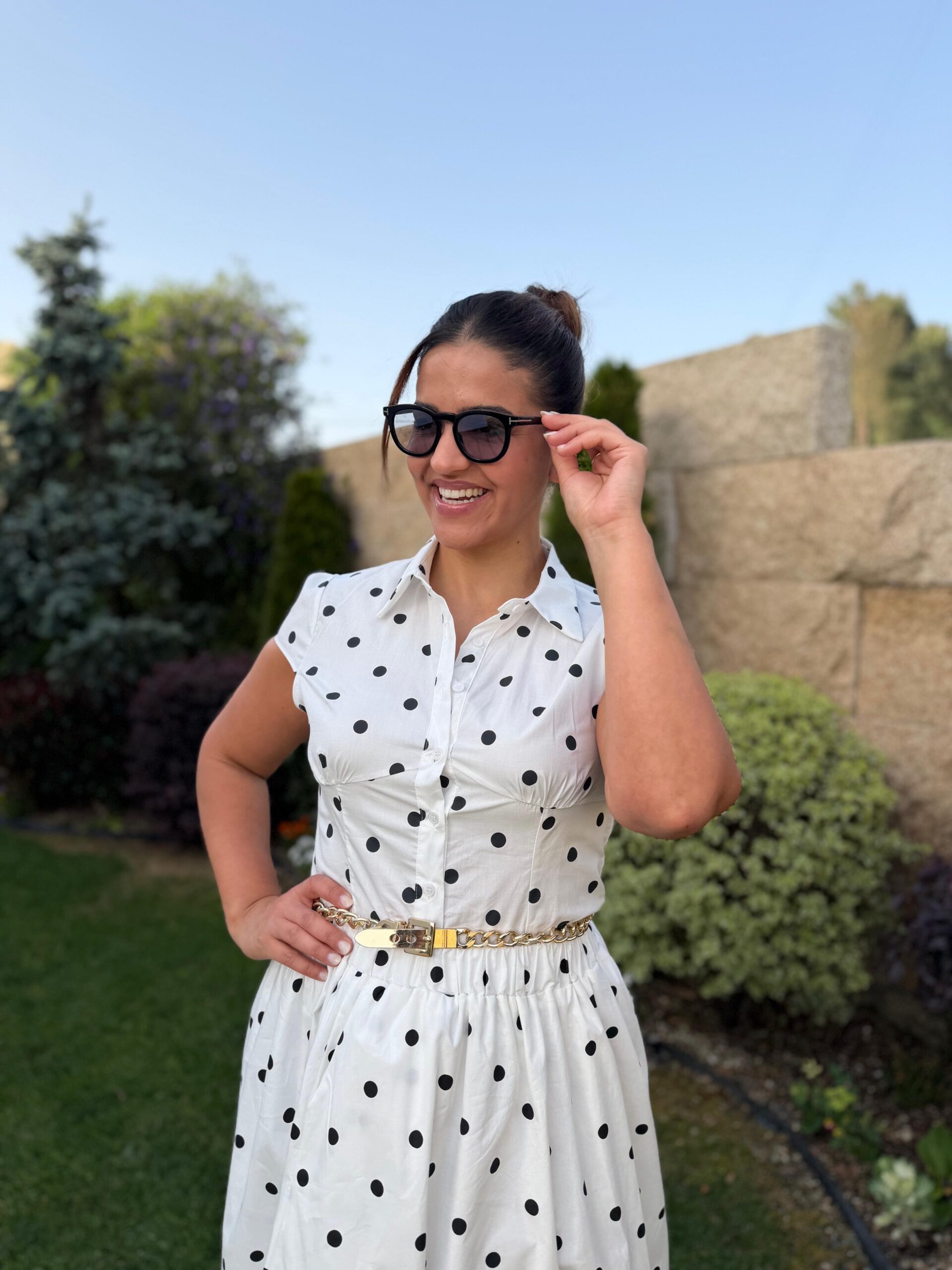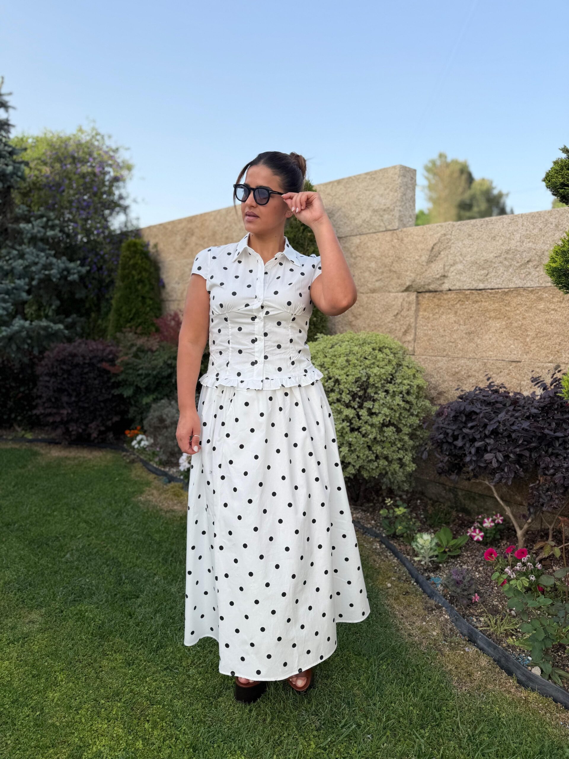 SAIA BRANCA COM BOLAS PRETAS PONTO CHIC