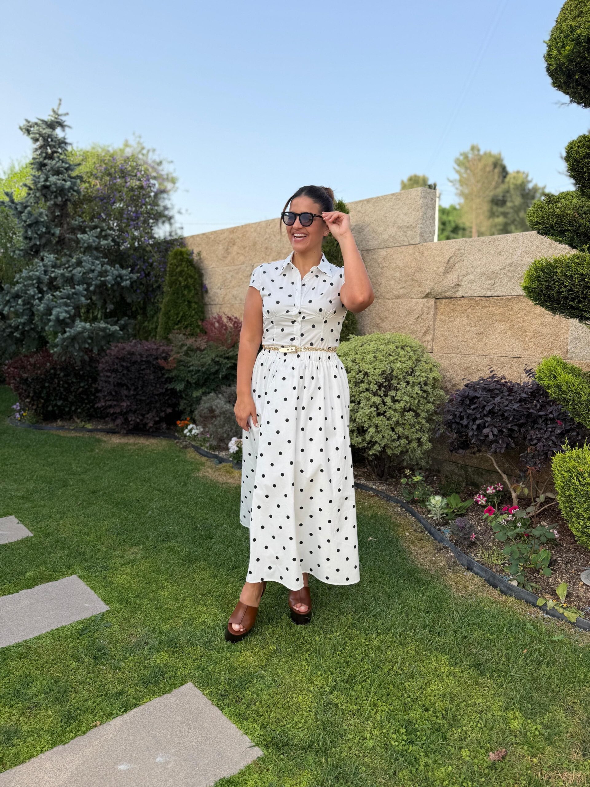 Apresenta um padrão clássico de bolas pretas, intemporal e versátil, que acrescenta personalidade ao look sem o tornar pesado. A cintura elástica proporciona um ajuste confortável e prático, adaptando-se facilmente a diferentes silhuetas e permitindo liberdade de movimento.