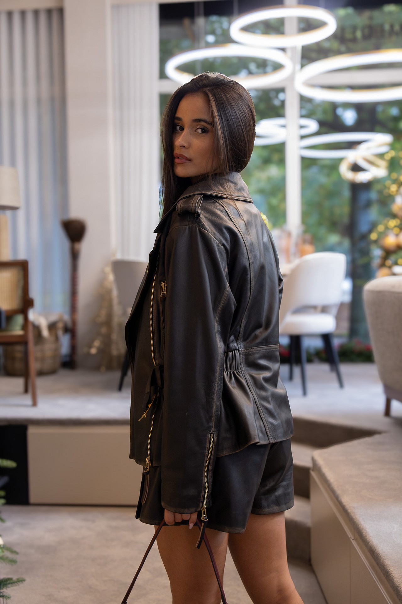 Ideal para coordenados urbanos ou mais arrojados, a saia-calção em pele castanha Sahoco combina perfeitamente com camisas de seda, malhas neutras ou blazers estruturados. Uma peça versátil e poderosa, perfeita para transitar do dia para a noite com atitude e sofisticação.
