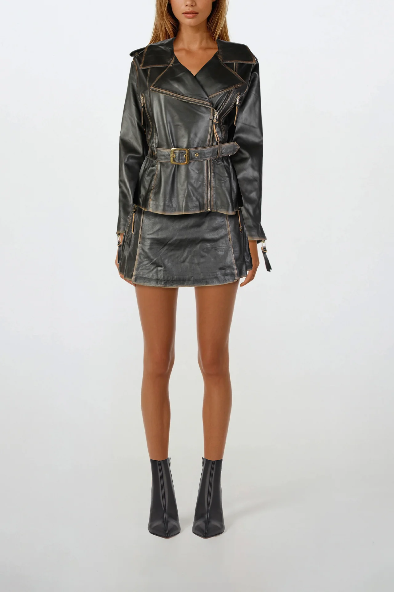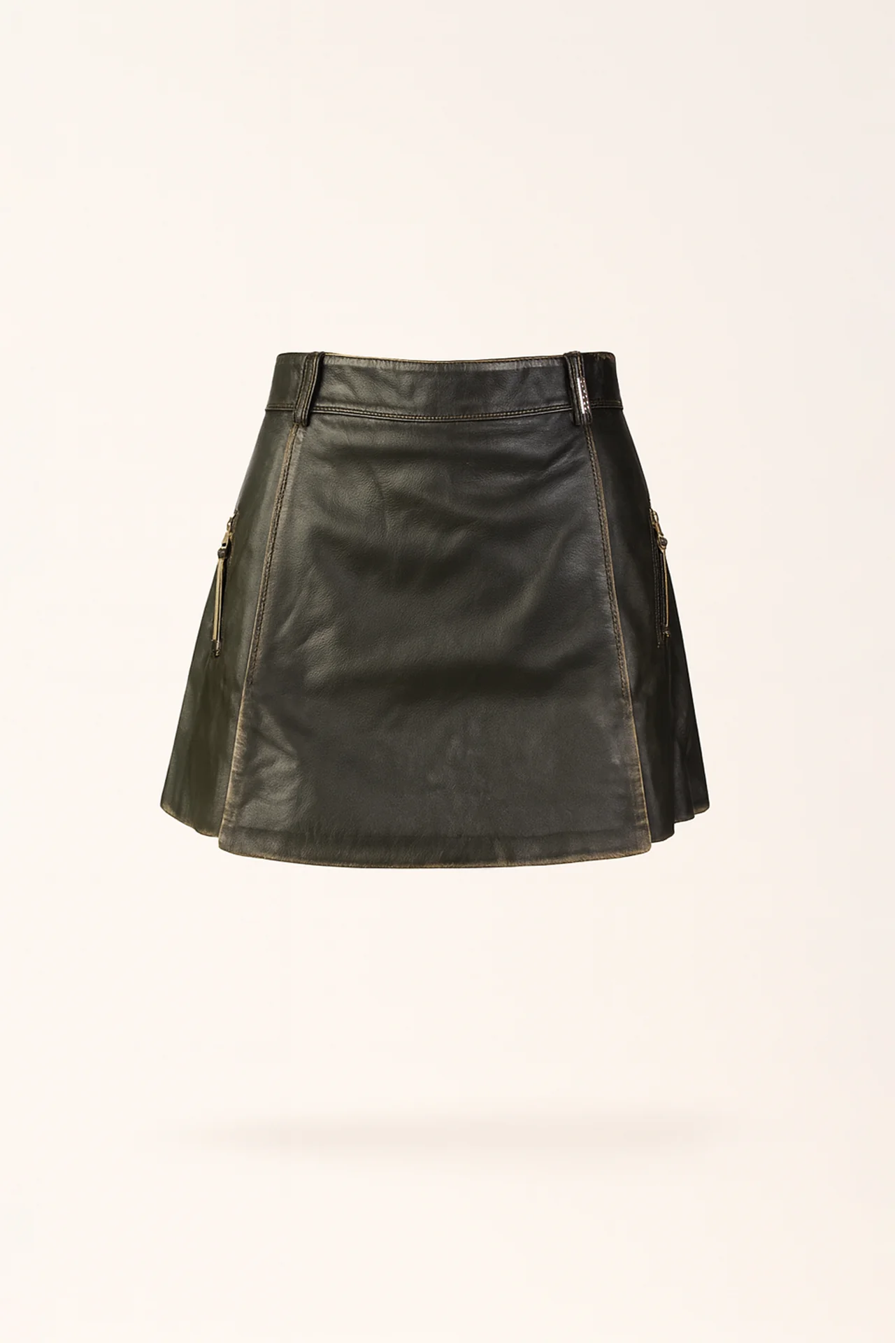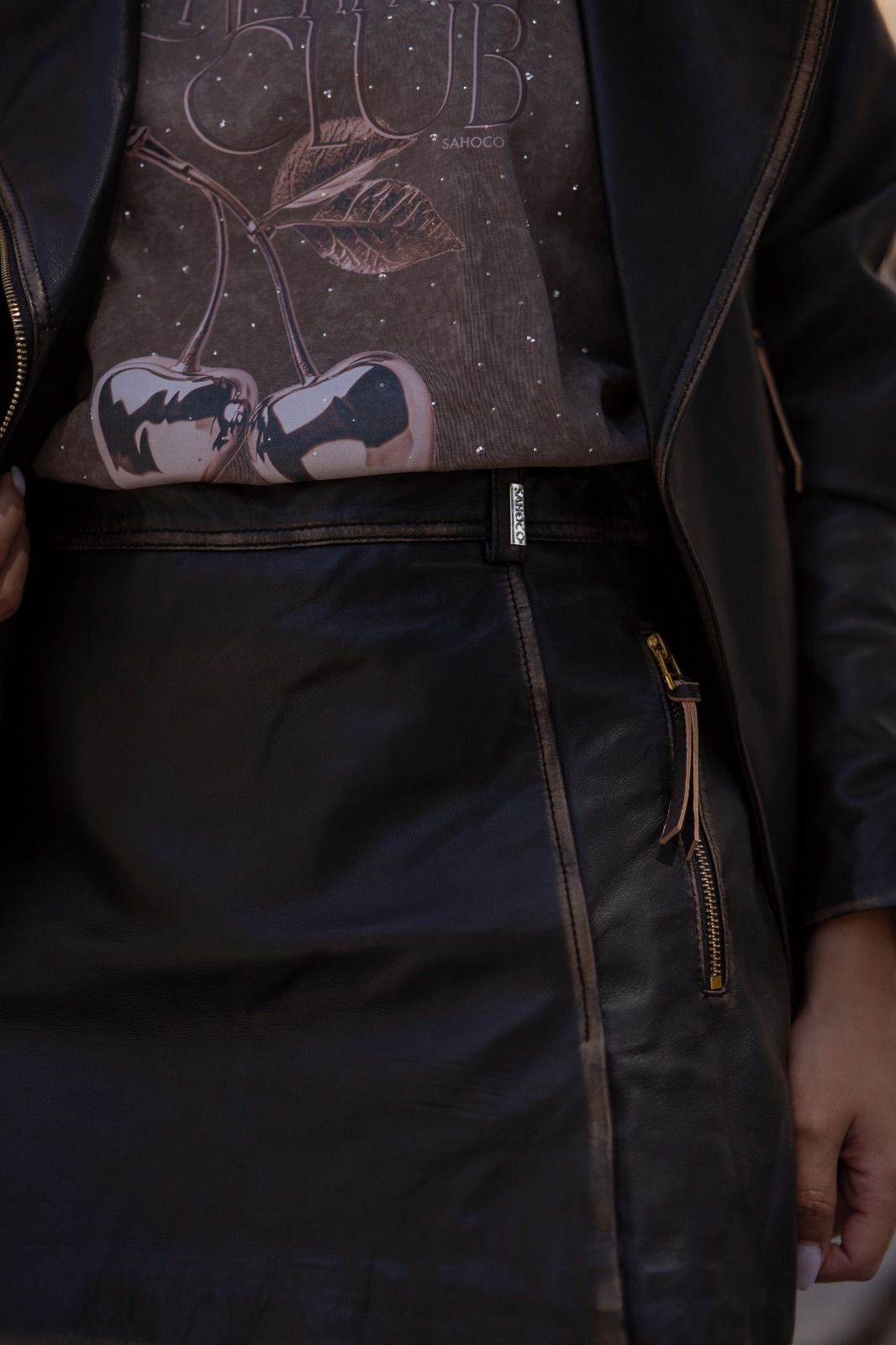 Com corte curto e estrutura tipo calção, esta saia-calção Sahoco destaca-se pelos fechos metálicos dourados e pelo acabamento em pele verdadeira, que conferem um visual moderno e luxuoso. A cintura média e o recorte limpo valorizam a silhueta, mantendo a elegância característica do estilo Sahoco.