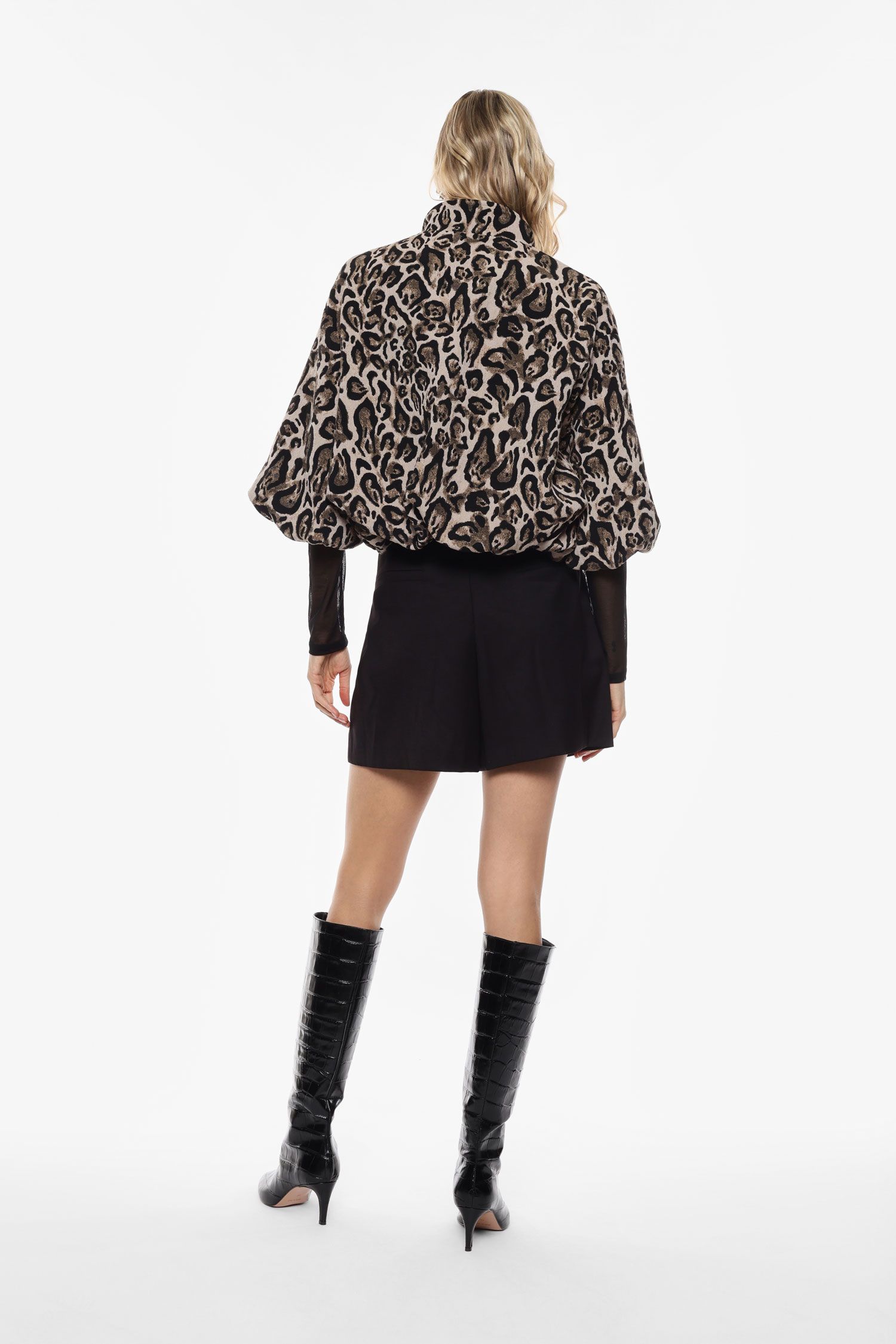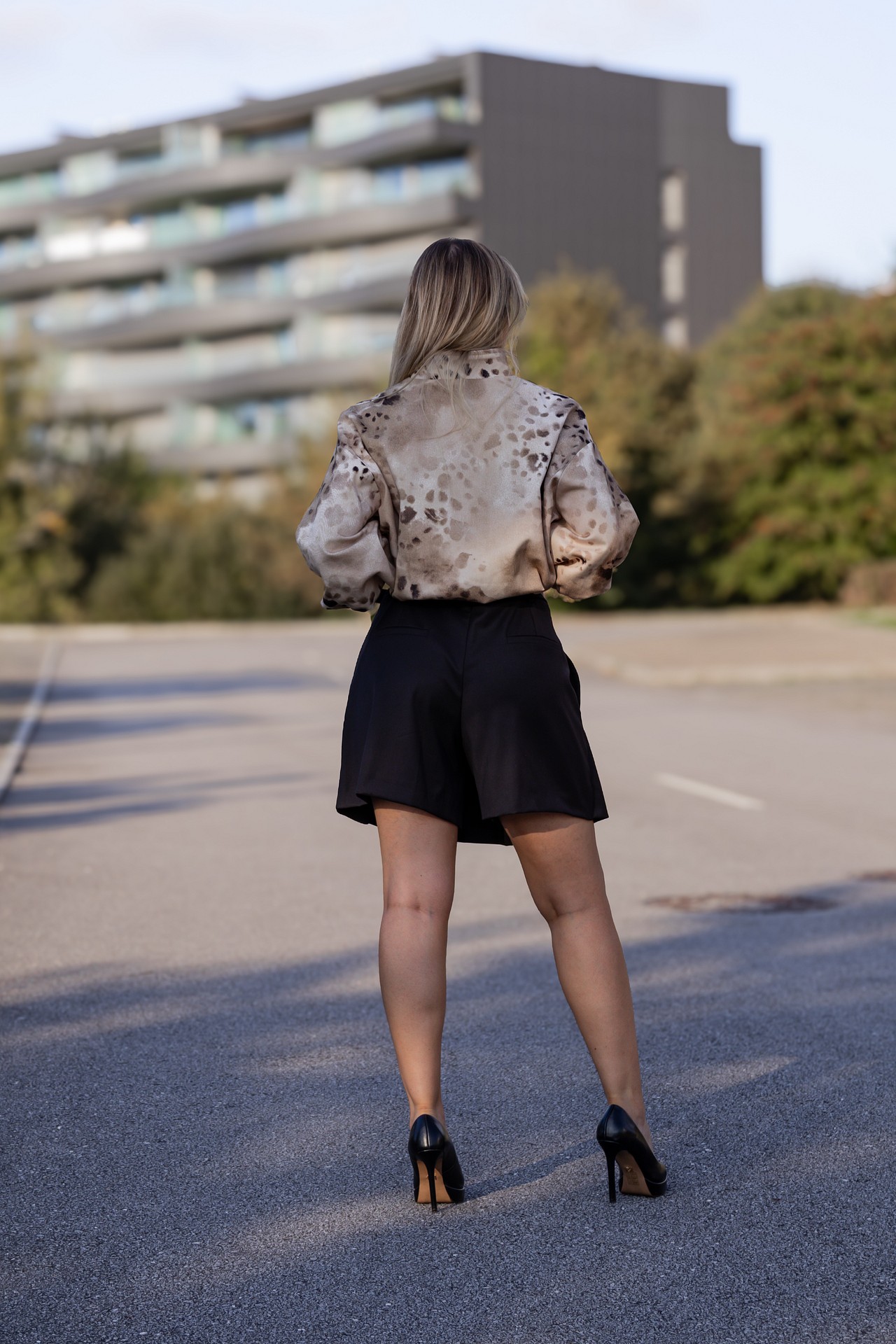 O seu corte estruturado com pregas na frente cria um efeito elegante e feminino, ao mesmo tempo que o design em formato calção assegura liberdade de movimentos e maior conforto no dia a dia. O detalhe do cinto em animal print com fivela dourada adiciona um contraste ousado e sofisticado, elevando a peça a um nível trendy e exclusivo.