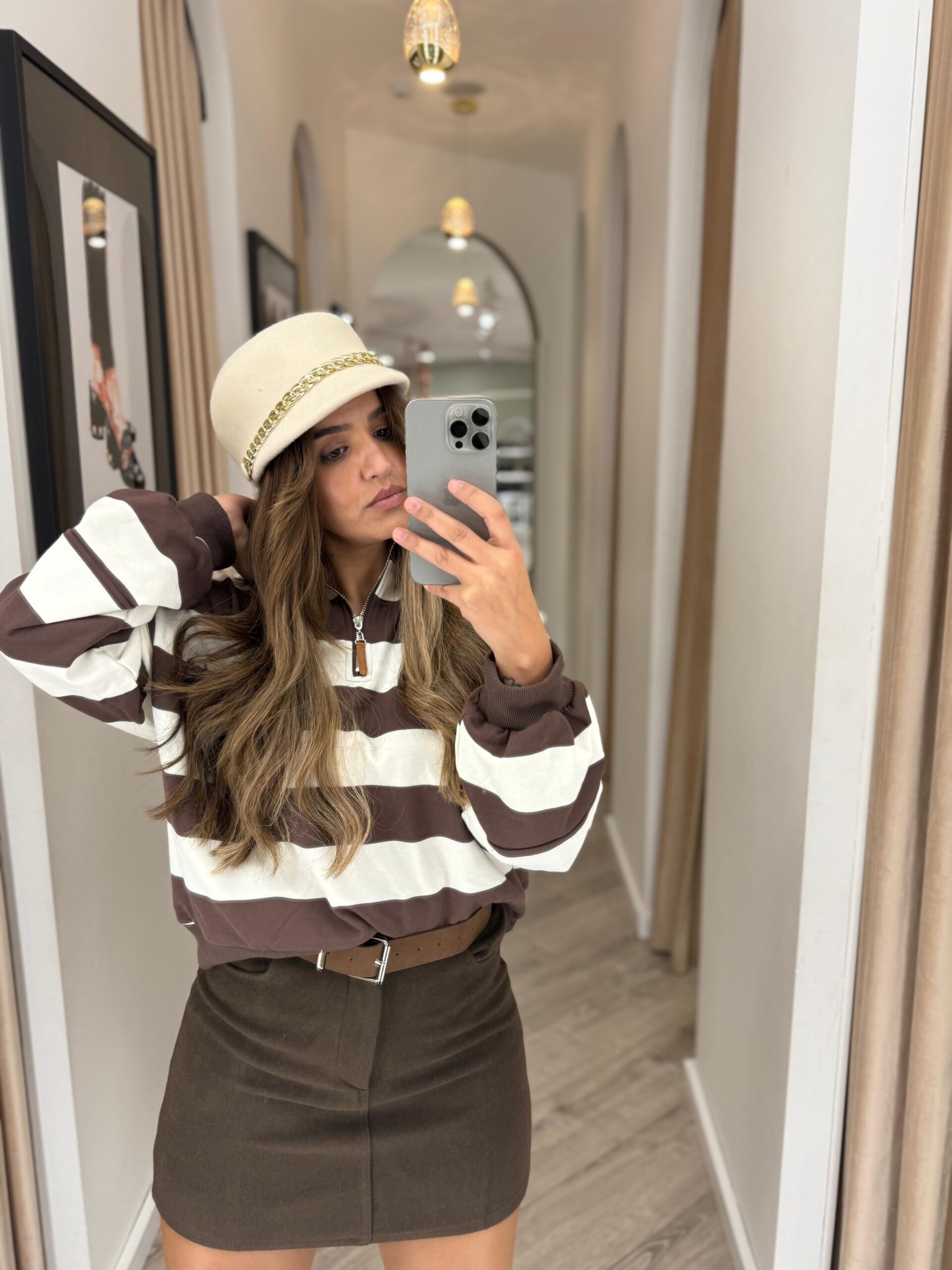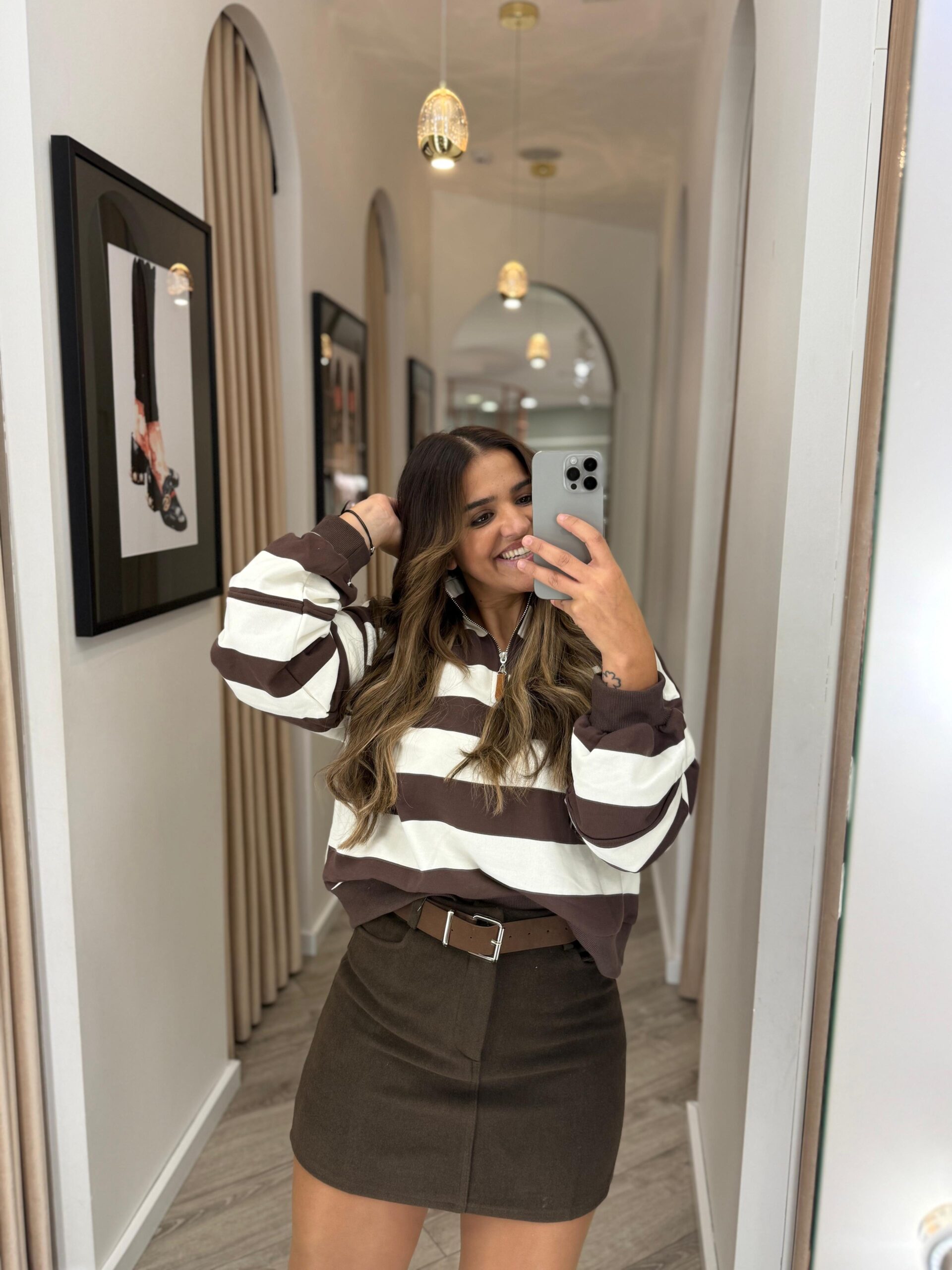 A saia castanha curta Ponto Chic é uma peça essencial no guarda-roupa feminino, combinando elegância minimalista com um toque moderno. Produzida em 60% poliéster, 20% viscose e 20% acrílico, o tecido apresenta uma textura estruturada e confortável, ideal para os dias de meia-estação e inverno.