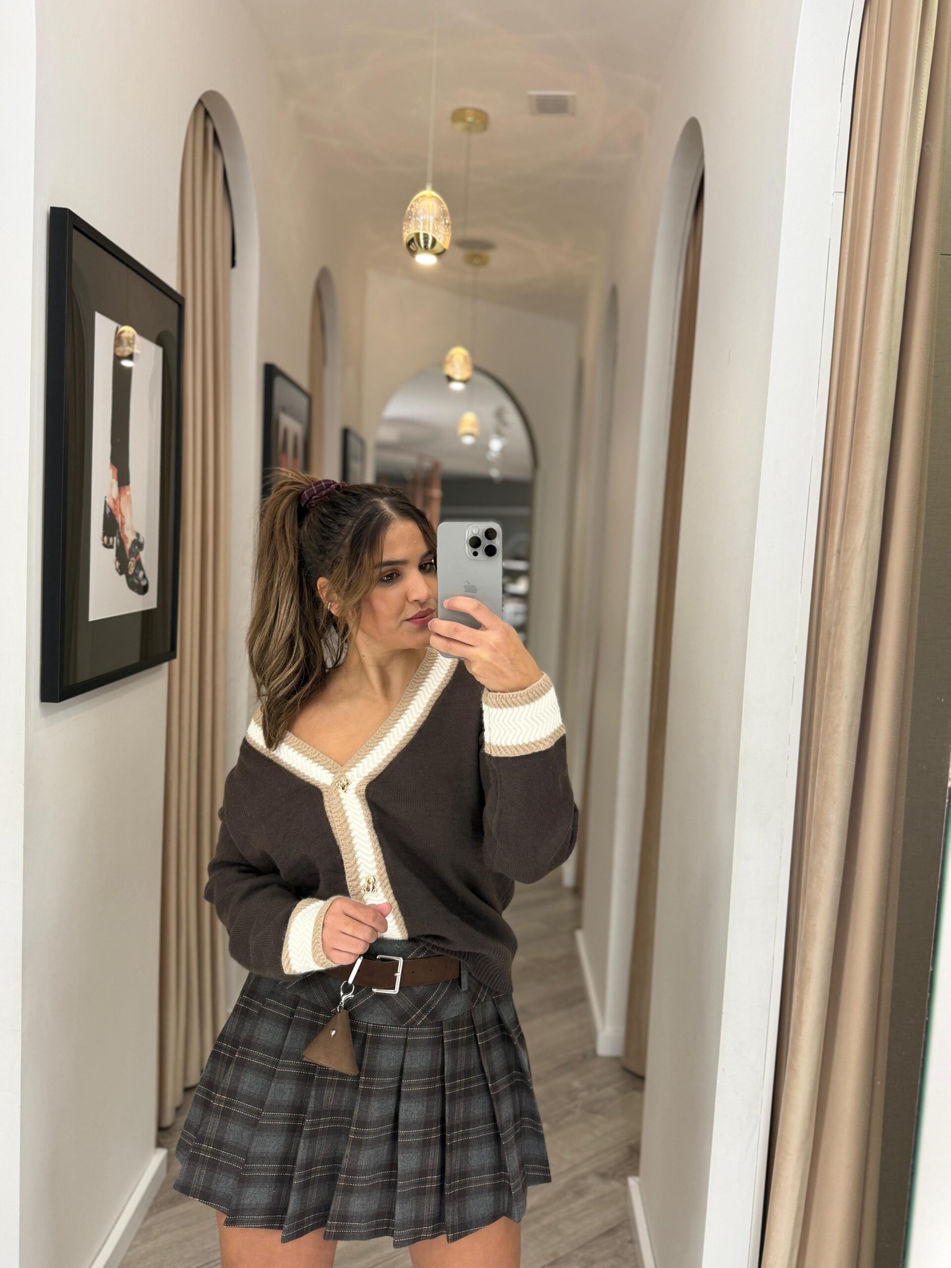 Com cintura subida e corte em A, esta saia valoriza a silhueta e confere um ar jovem e versátil. O padrão xadrez em tons de castanho e bege adiciona textura e um charme intemporal, ideal para os dias de outono.