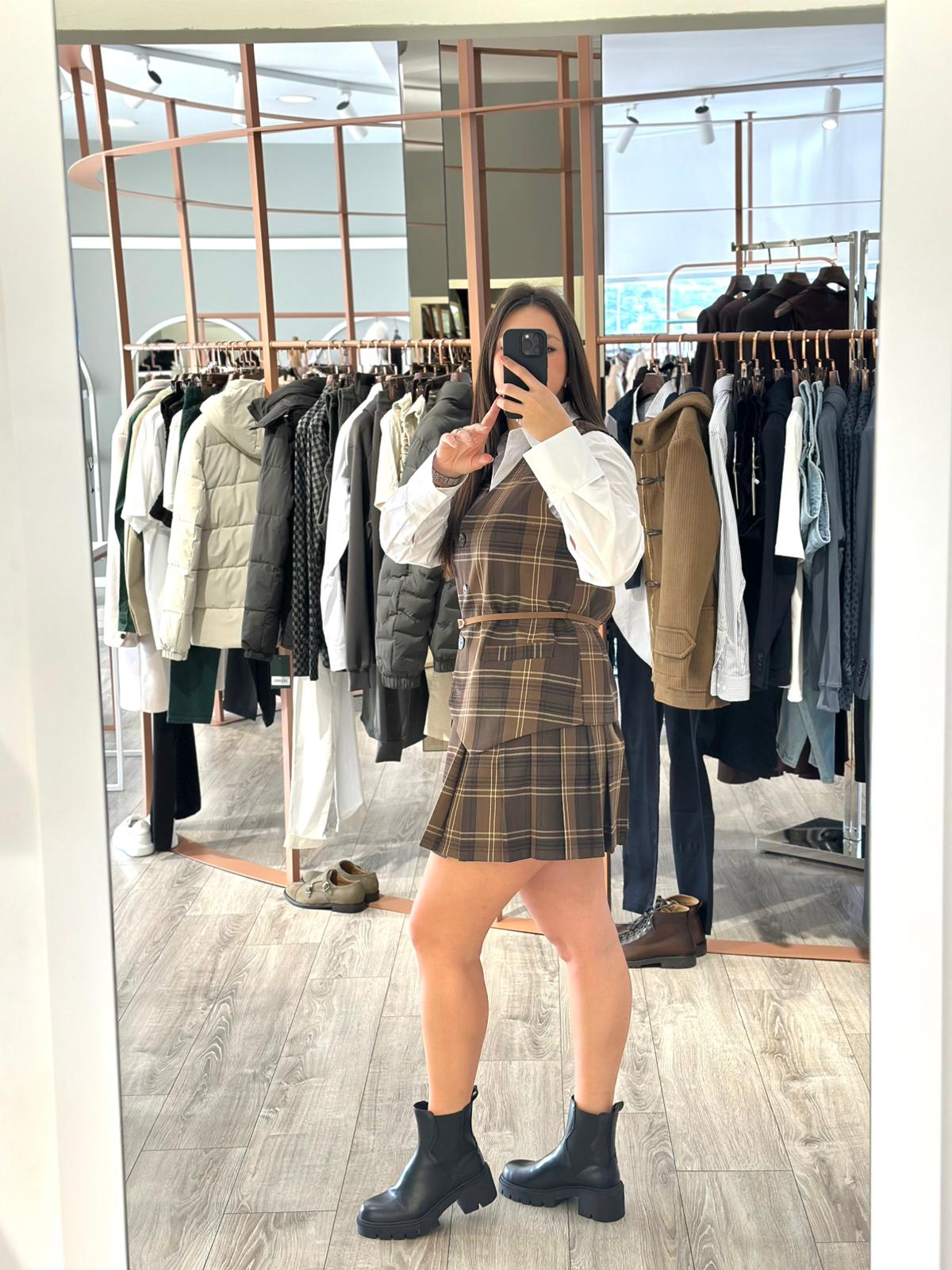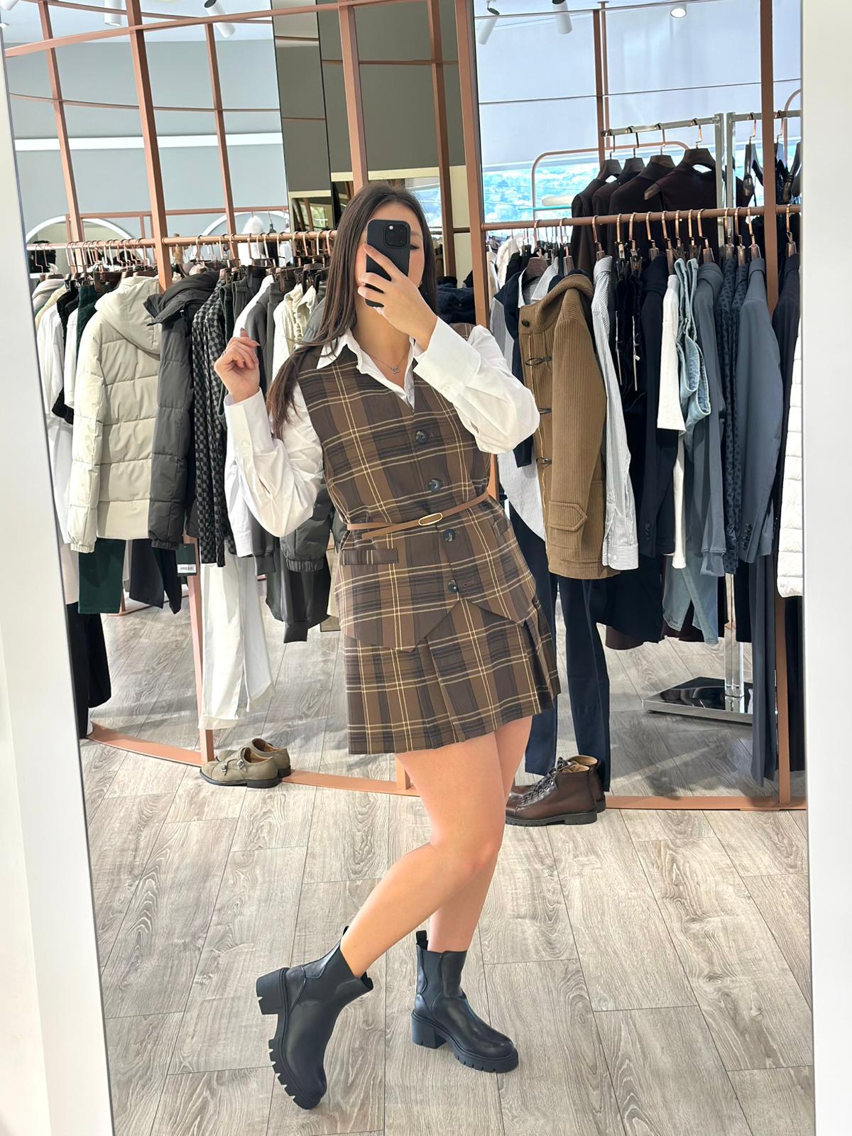 O padrão xadrez em tons moro/nero confere-lhe um estilo clássico e sofisticado, enquanto o corte curto com pregas dá movimento e modernidade ao visual. O design valoriza a silhueta e é ideal para quem procura um equilíbrio entre o charme tradicional e o espírito urbano.