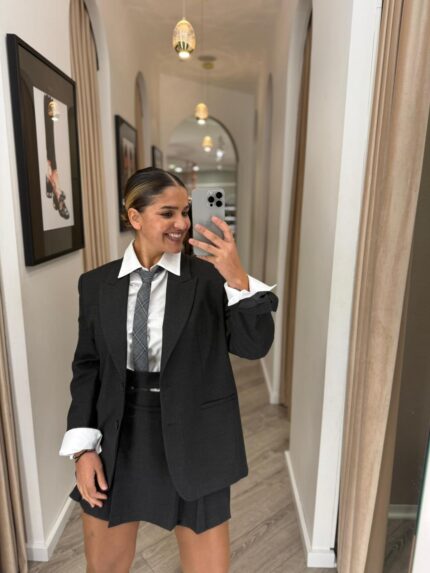 O modelo de corte lápis valoriza a silhueta, enquanto o detalhe na cintura com pregas horizontais e botões metálicos decorativos acrescenta modernidade e charme. A racha discreta na frente proporciona mobilidade e um toque sensual na medida certa.