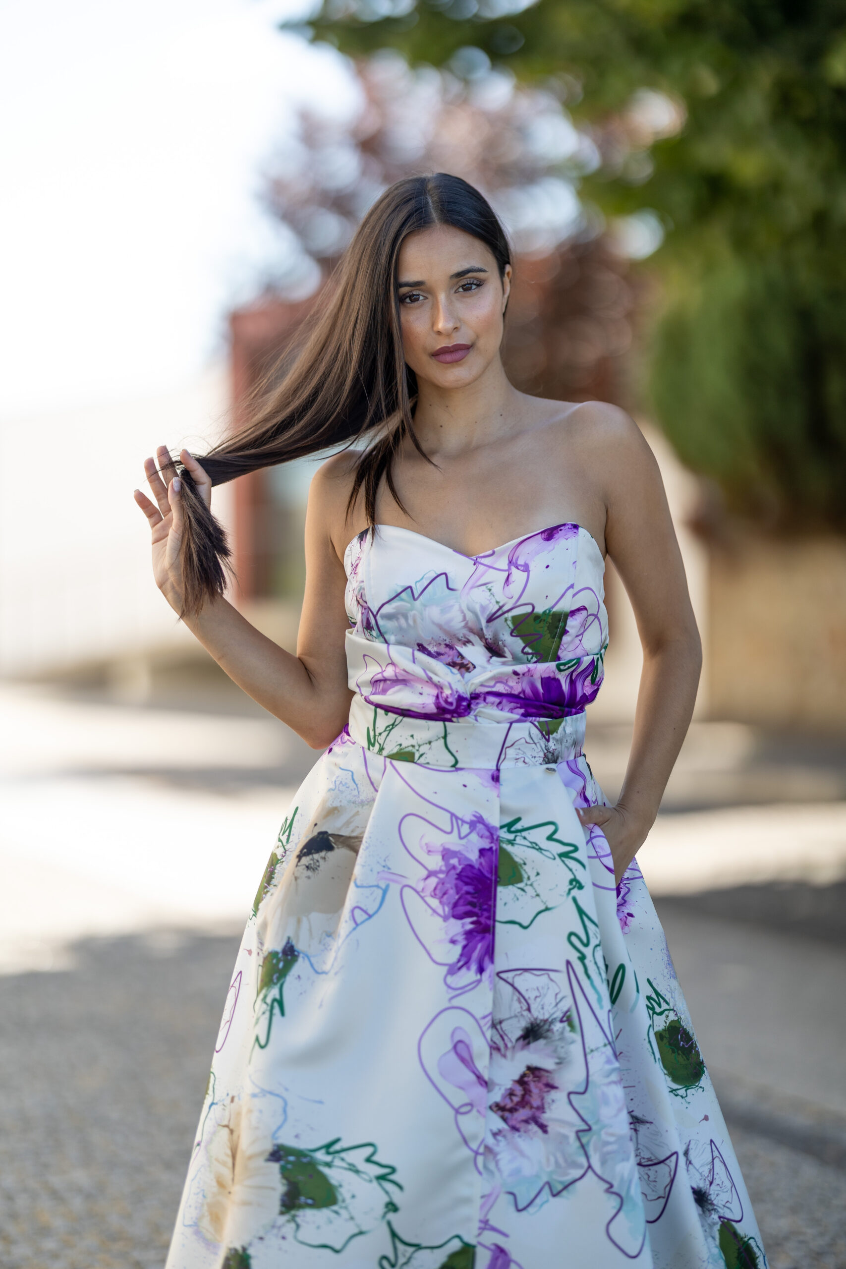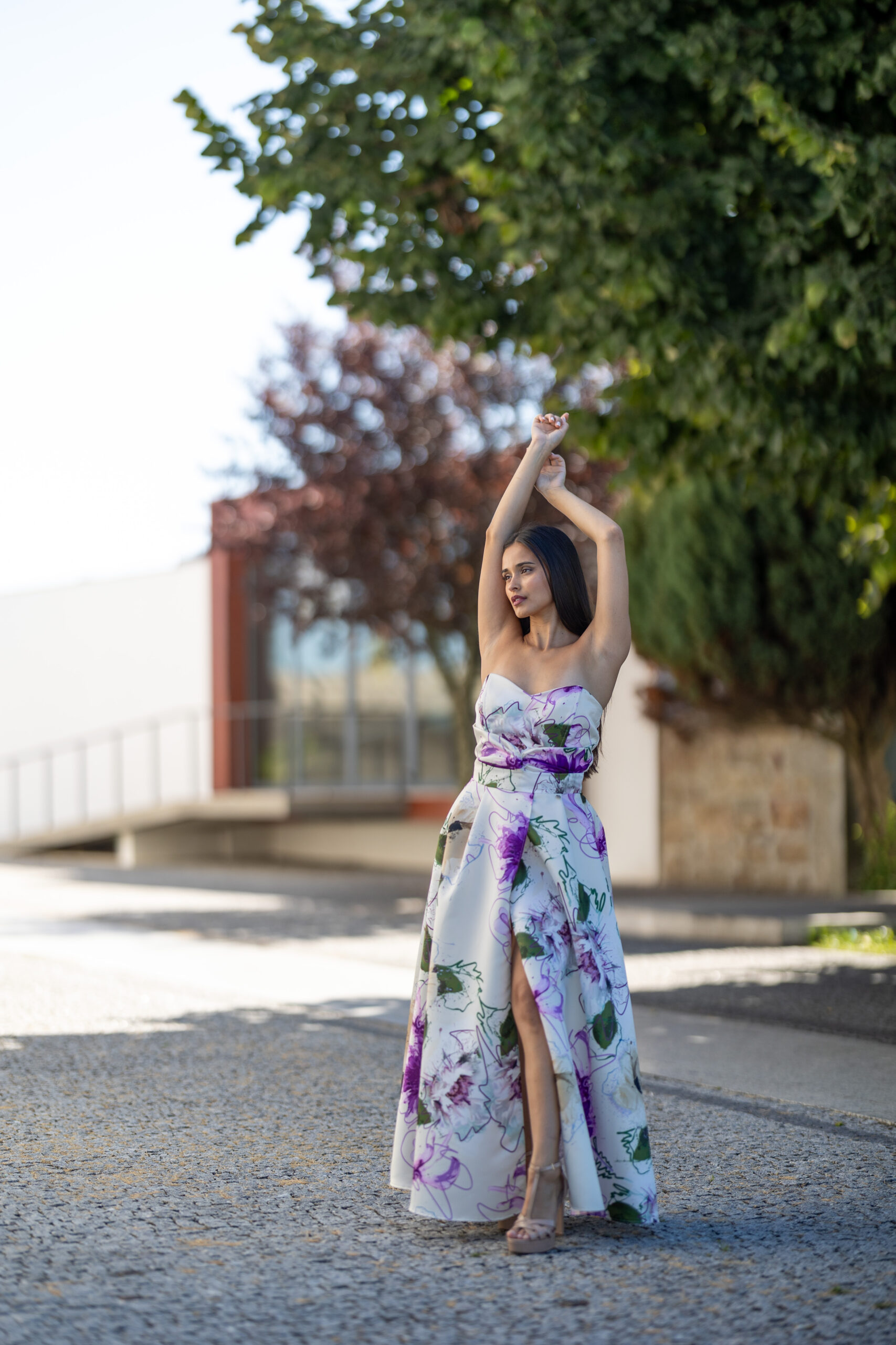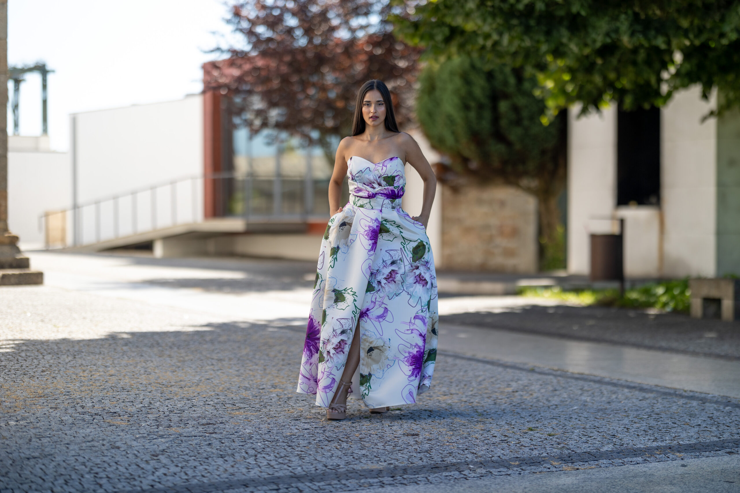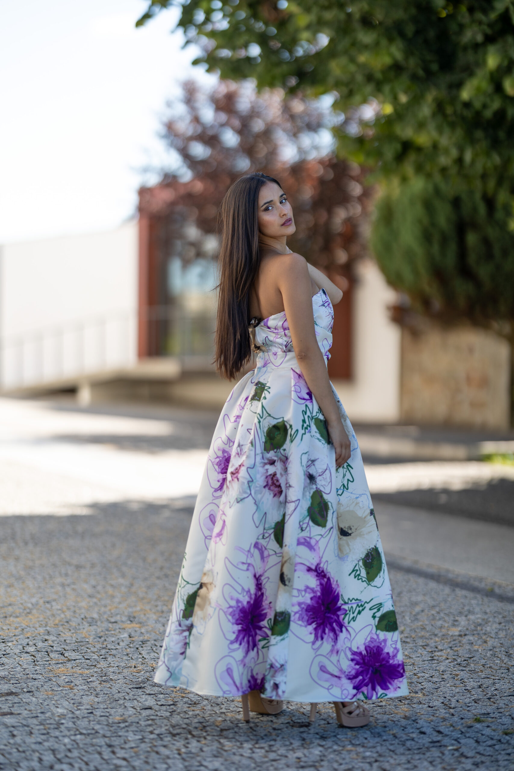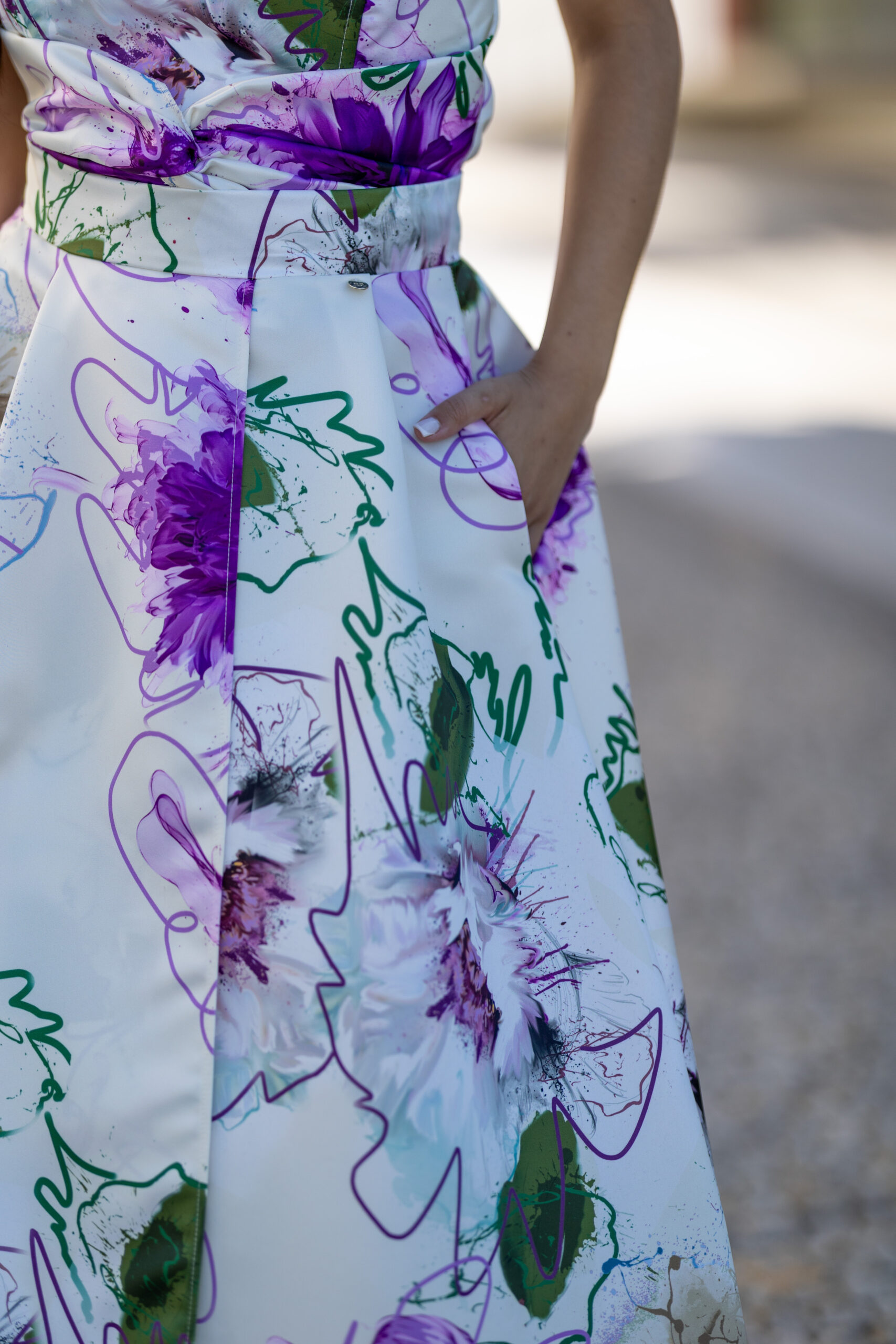 O modelo destaca-se pela estampa abstrata multicolorida — uma fusão de tons de verde, lilás e bege sobre fundo claro, que confere um toque moderno e criativo. As pregas subtis na cintura adicionam volume e feminilidade, enquanto o fecho discreto assegura um ajuste perfeito.