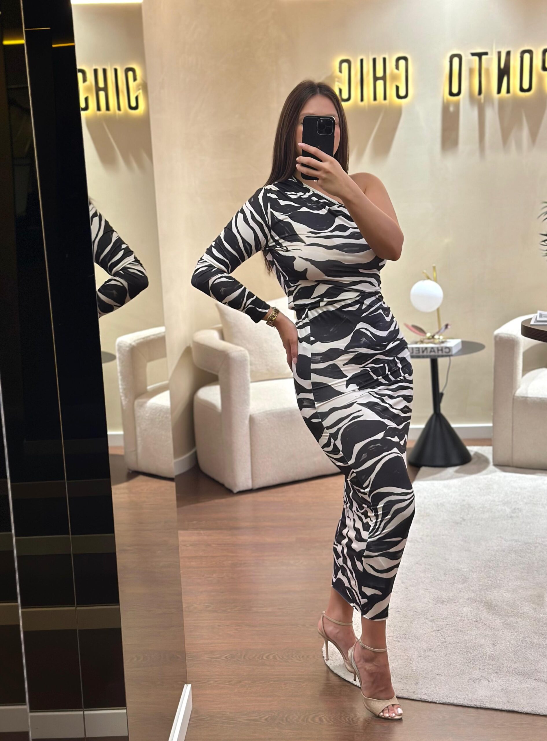 O estampado animal print em preto e branco confere um toque arrojado e moderno, enquanto o corte midi ajustado cria uma linha visual alongada e sofisticada. Ideal para conjugar com o body zebra Rinascimento, formando um conjunto coordenado de forte impacto visual.