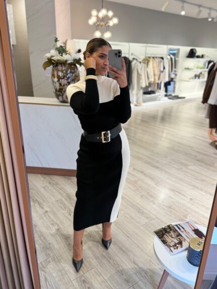 O modelo apresenta pregas marcadas que conferem volume e dinamismo à peça, além de um cinto ajustável com fivela metálica e mini bolsa decorativa, que acrescentam um detalhe moderno e prático.