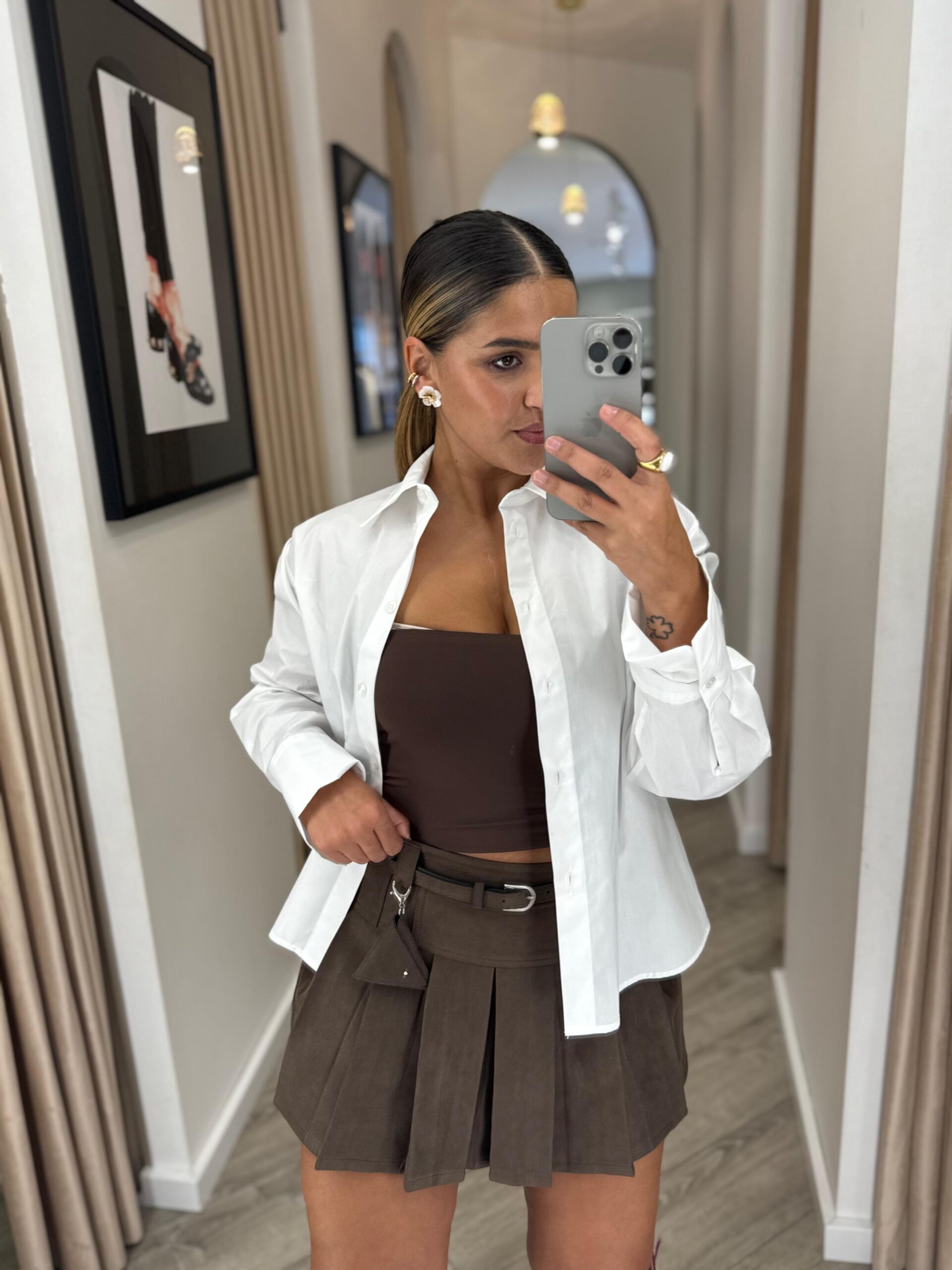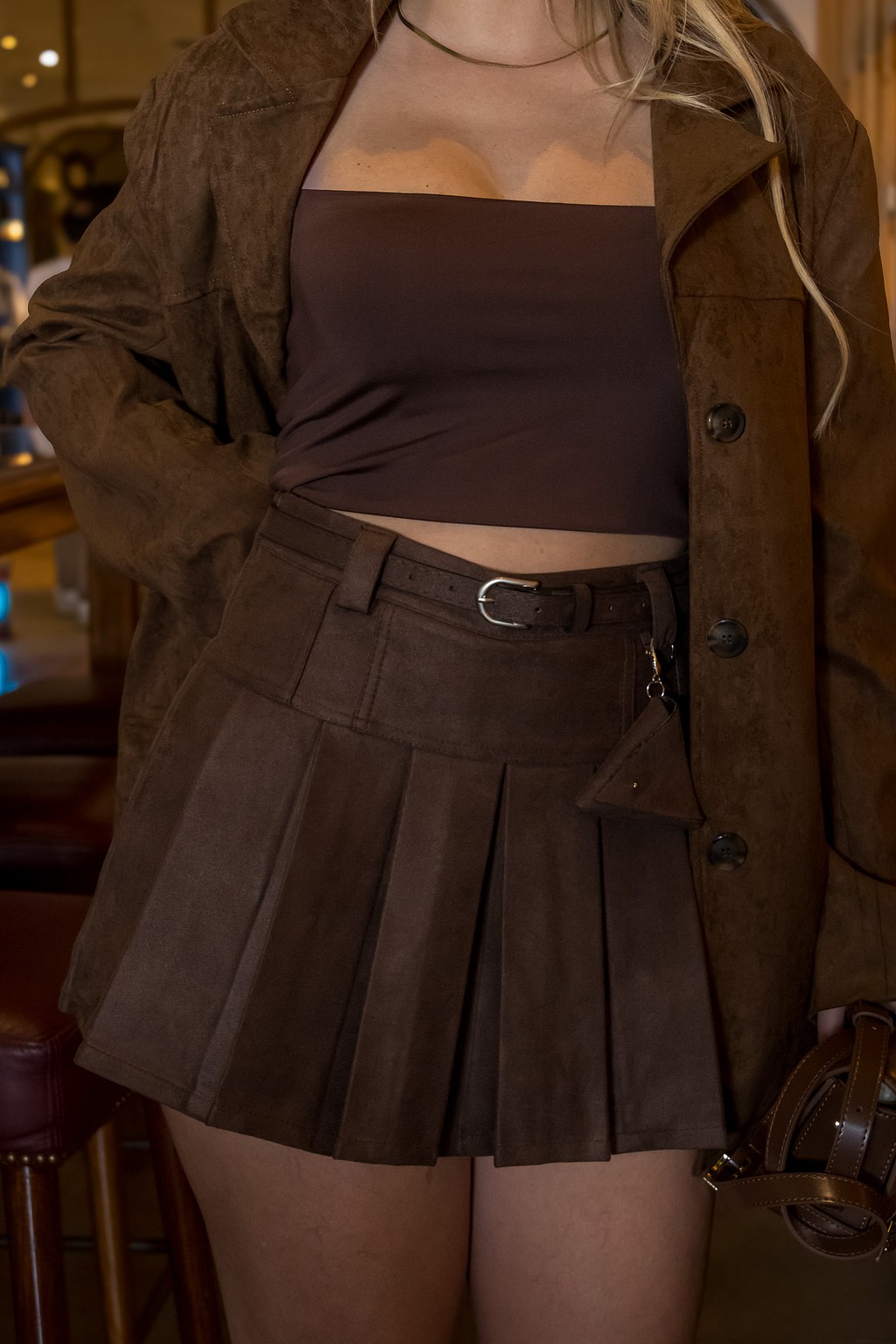 SAIA PLISSADA EM CAMURÇA CASTANHA PONTO CHIC
