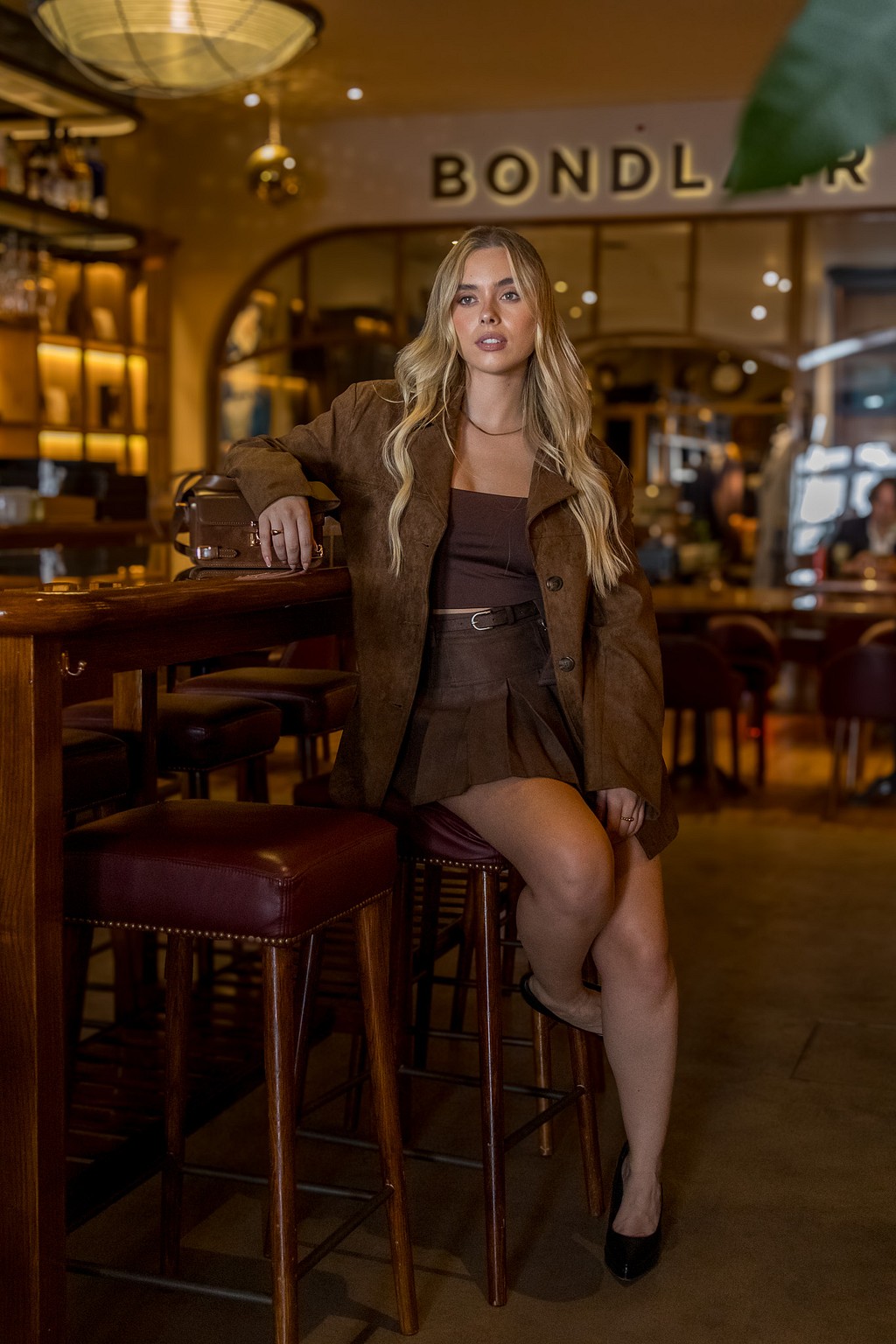 A saia plissada em camurça castanha Ponto Chic combina charme contemporâneo e um toque vintage irresistível. Produzida em 92% poliéster e 8% spandex, oferece conforto, elasticidade e um caimento estruturado que valoriza a silhueta com movimento e elegância.