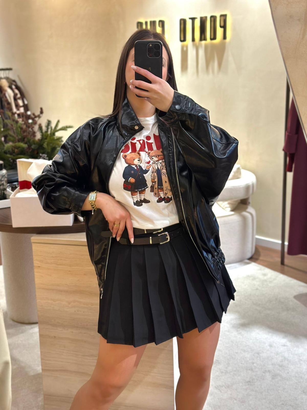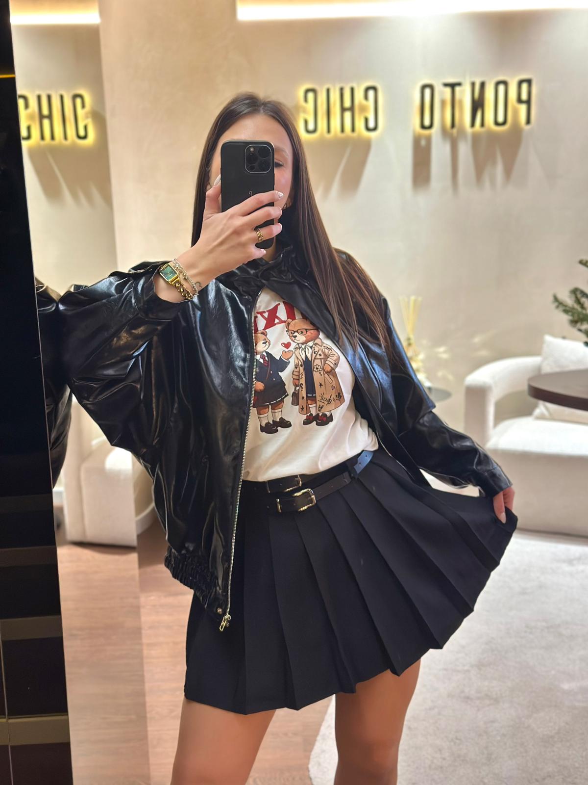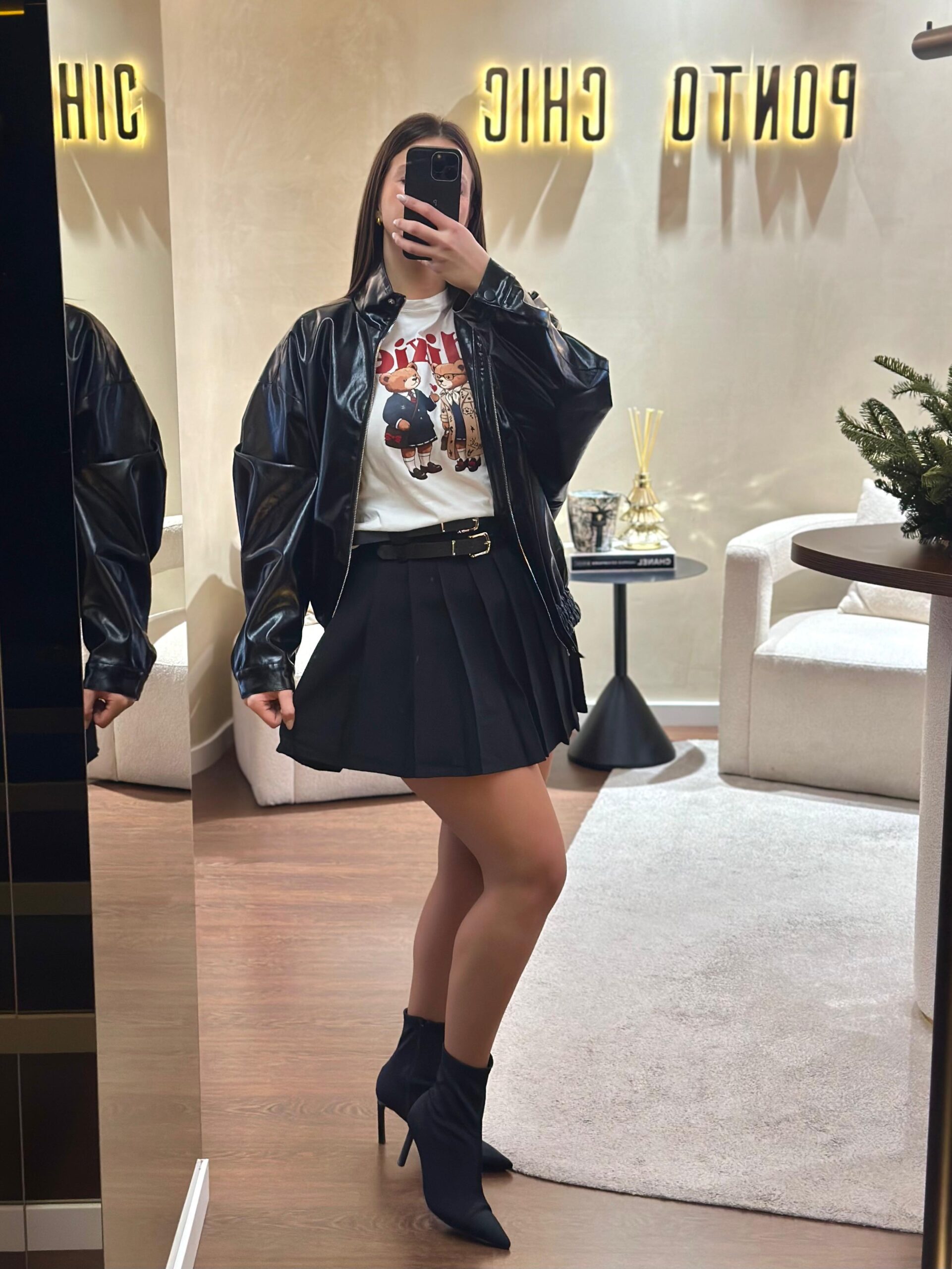 Elegante e fluida, esta saia plissada preta destaca-se pelo movimento leve e pela silhueta sofisticada que cria a cada passo. Confeccionada em tecido com 95% poliéster e 5% elastano, oferece conforto, leveza e uma elasticidade subtil que garante um vestir agradável ao longo do dia.