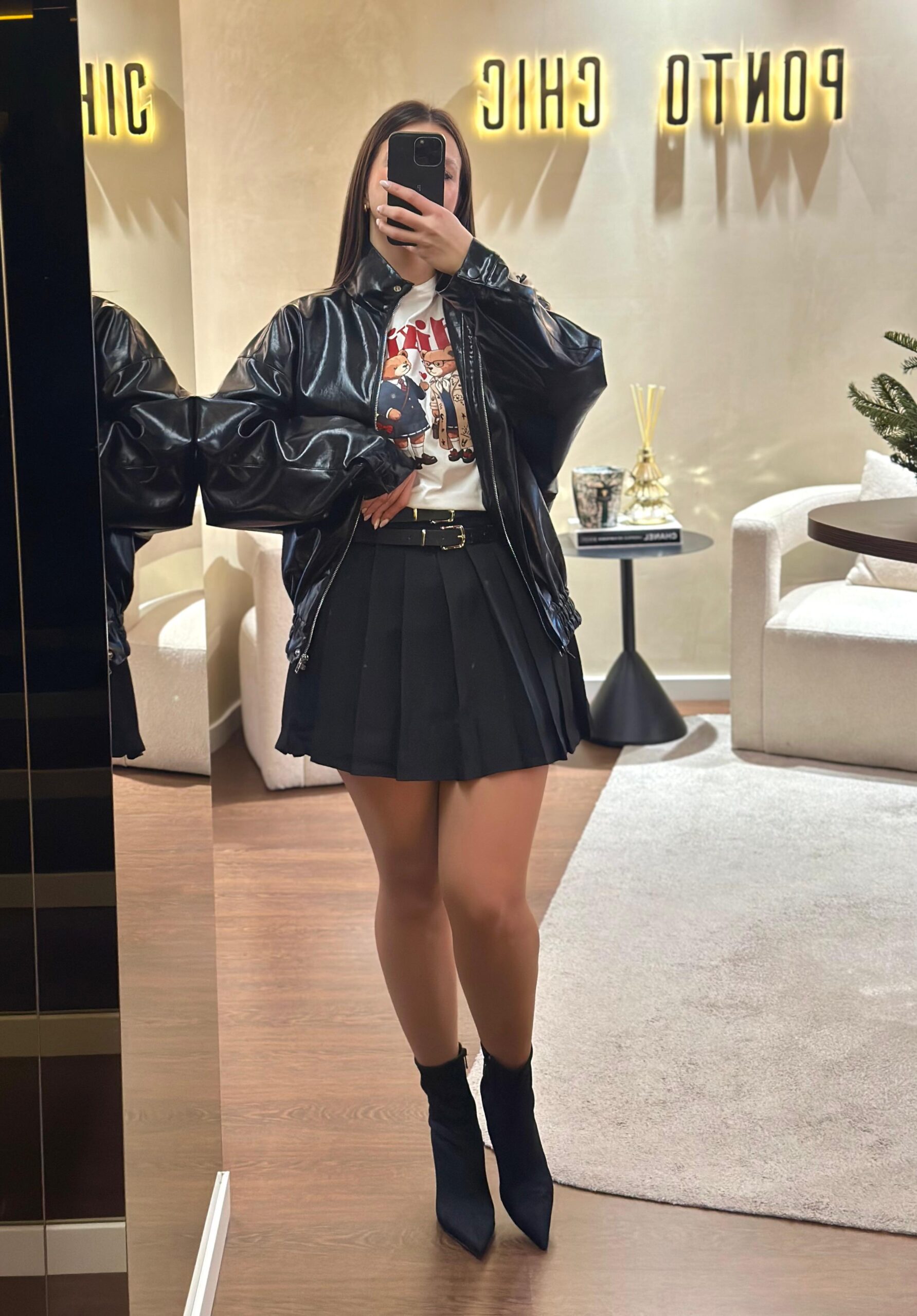 SAIA PLISSADA PRETA COM CINTO DUPLO PONTO CHIC