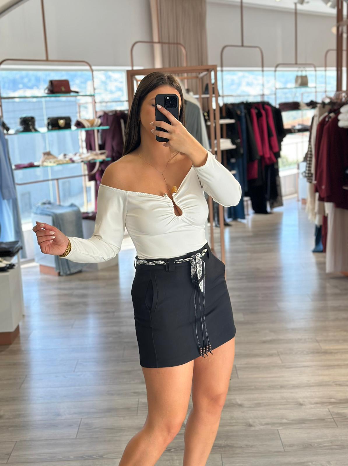 O design destaca-se pelo cinto estampado em padrão paisley com aplicações de missangas em cordão preto, que acrescenta contraste e um detalhe artesanal, transformando a saia preta num modelo único e cheio de personalidade.