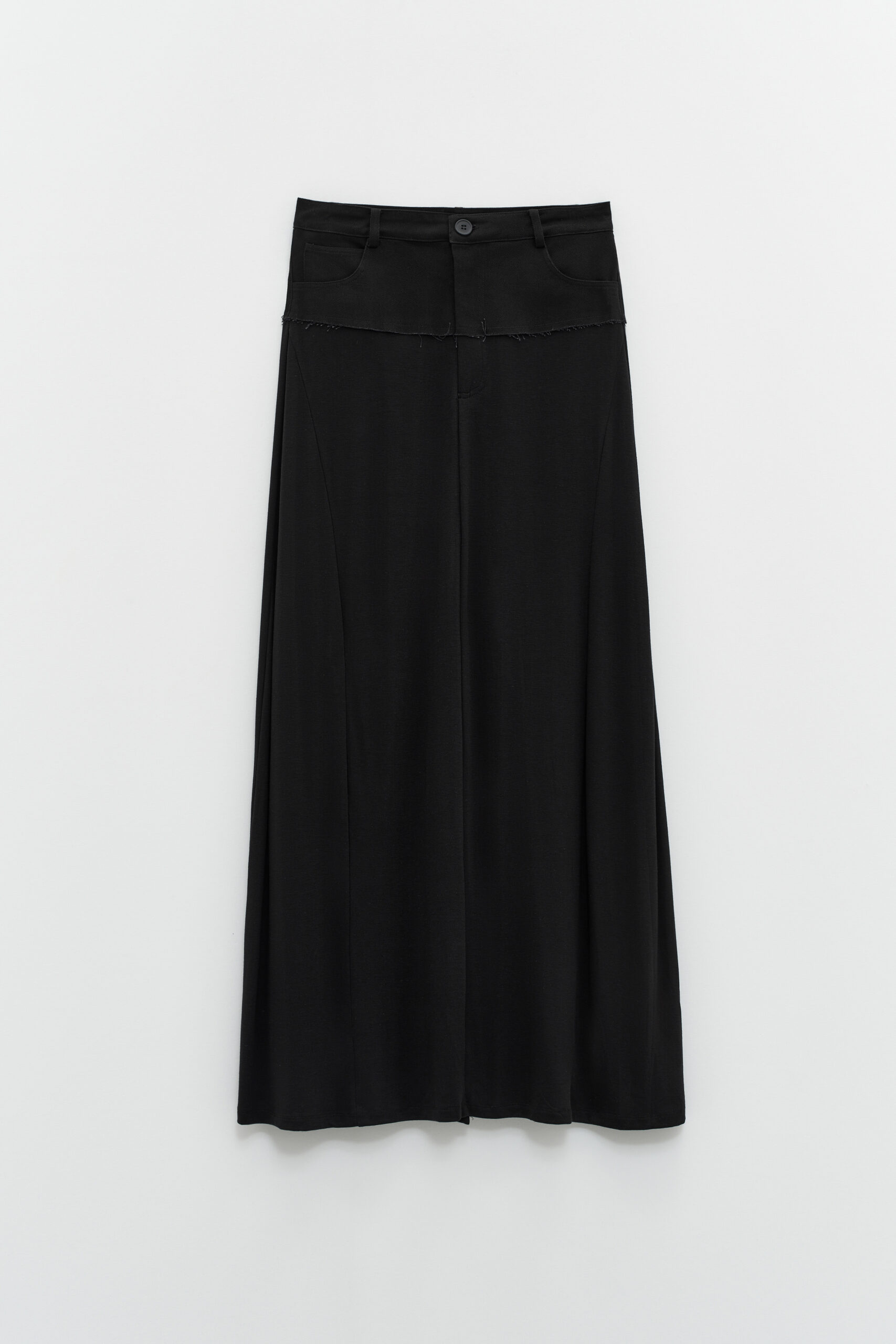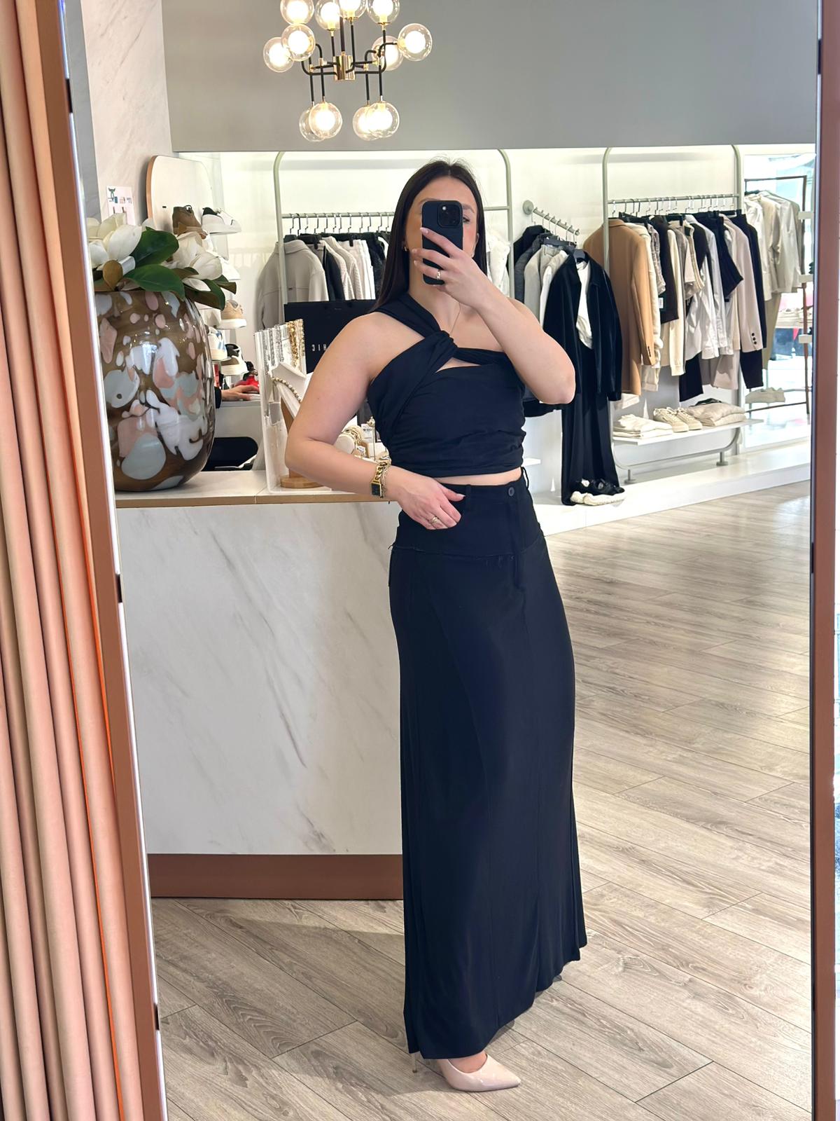 Saia na cor preta em malha fina com forro com detalhes em ganga . Dois bolsos na parte da frente e na parte de trás para uma maior versatilidade. Aperta com botõ e fecho de correr , uma peça deslunbrante que não pode faltar o seu guarda roupa .