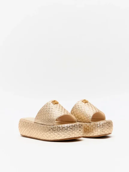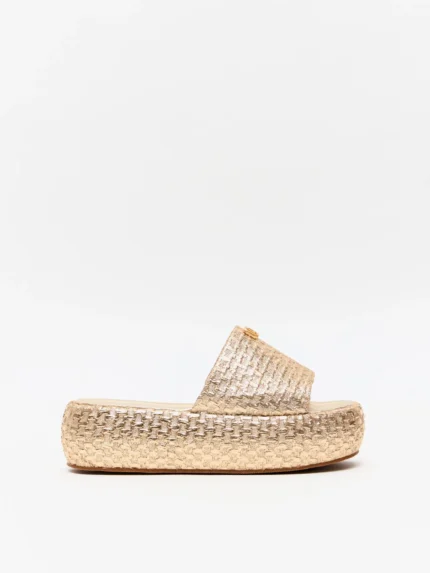 SANDÁLIA DOURADA METALIZADA EM PALHA LANÇA PERFUME