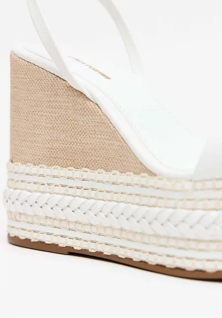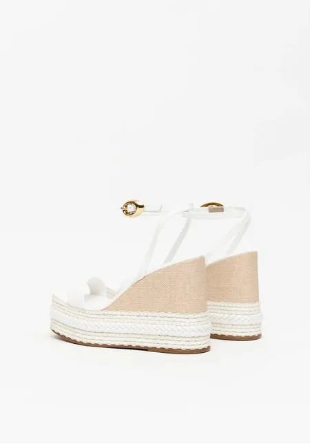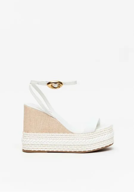 Sandália plataforma em tom off white, confeccionada em 100% pele, combinada com cunha revestida em ráfia natural entrançada, criando um contraste sofisticado entre textura orgânica e acabamento contemporâneo.