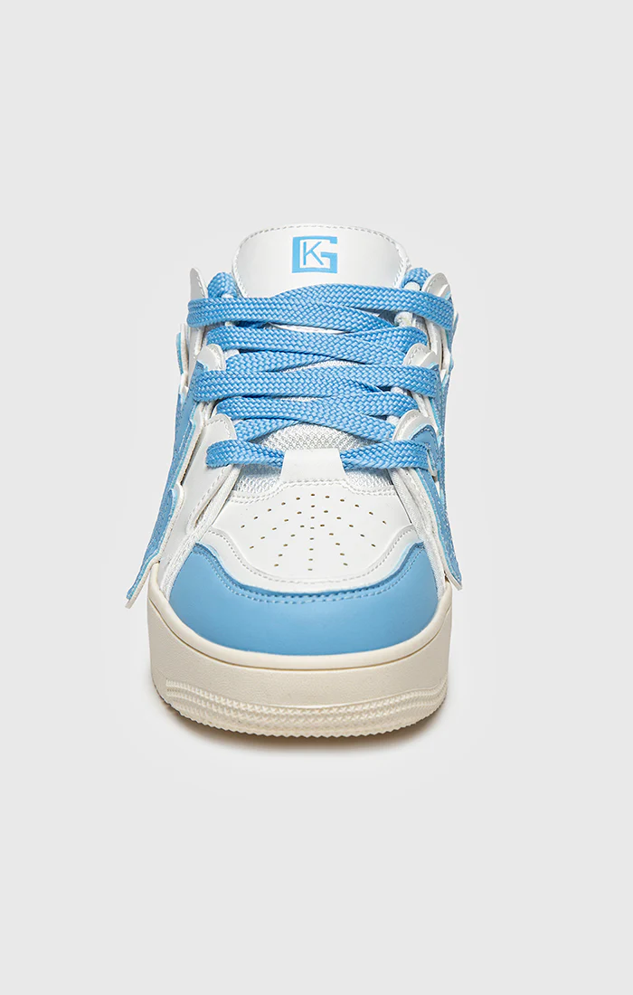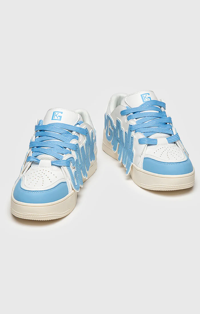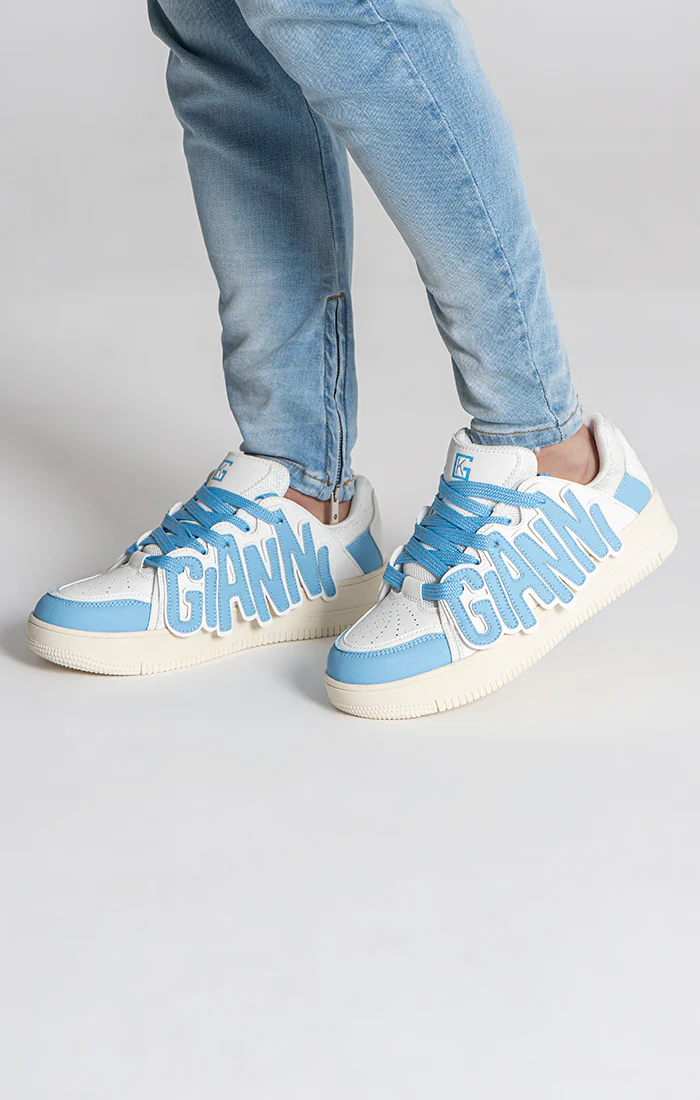 O design destaca-se pela combinação harmoniosa de azul e branco, pela sola robusta e pelo icónico lettering GIANNI em grande destaque na lateral — um detalhe irreverente que reforça o estilo forte e urbano da marca. A gáspea texturizada, os atacadores azuis e a sola com plataforma subtil conferem uma silhueta atual, jovem e cheia de personalidade.