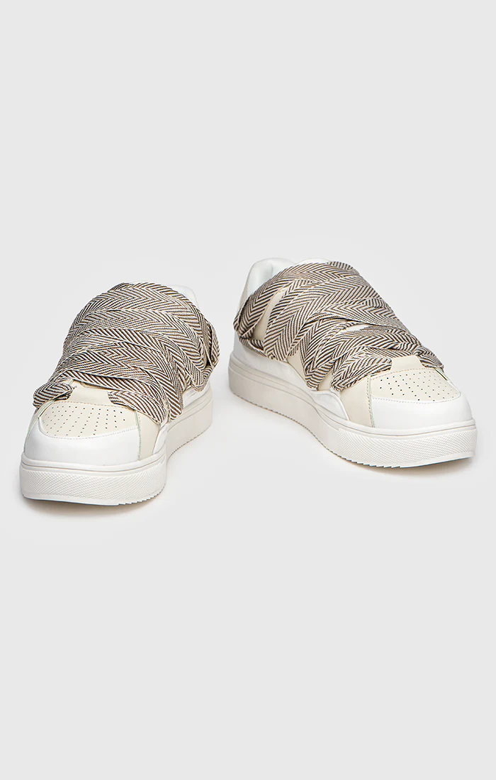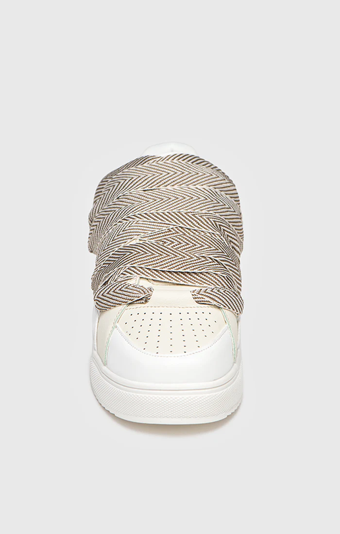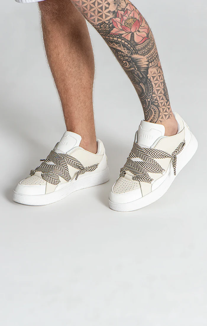 O design distingue-se pelo tom bege versátil, pelas texturas contrastantes e pela sola branca robusta que assegura estabilidade e presença visual. O detalhe GIANNI aplicado na lateral reforça a identidade da marca e adiciona um elemento de destaque que transforma estas sapatilhas numa afirmação de estilo. Os atacadores, a gáspea recortada e a silhueta contemporânea completam um visual clean, moderno e muito fácil de combinar.