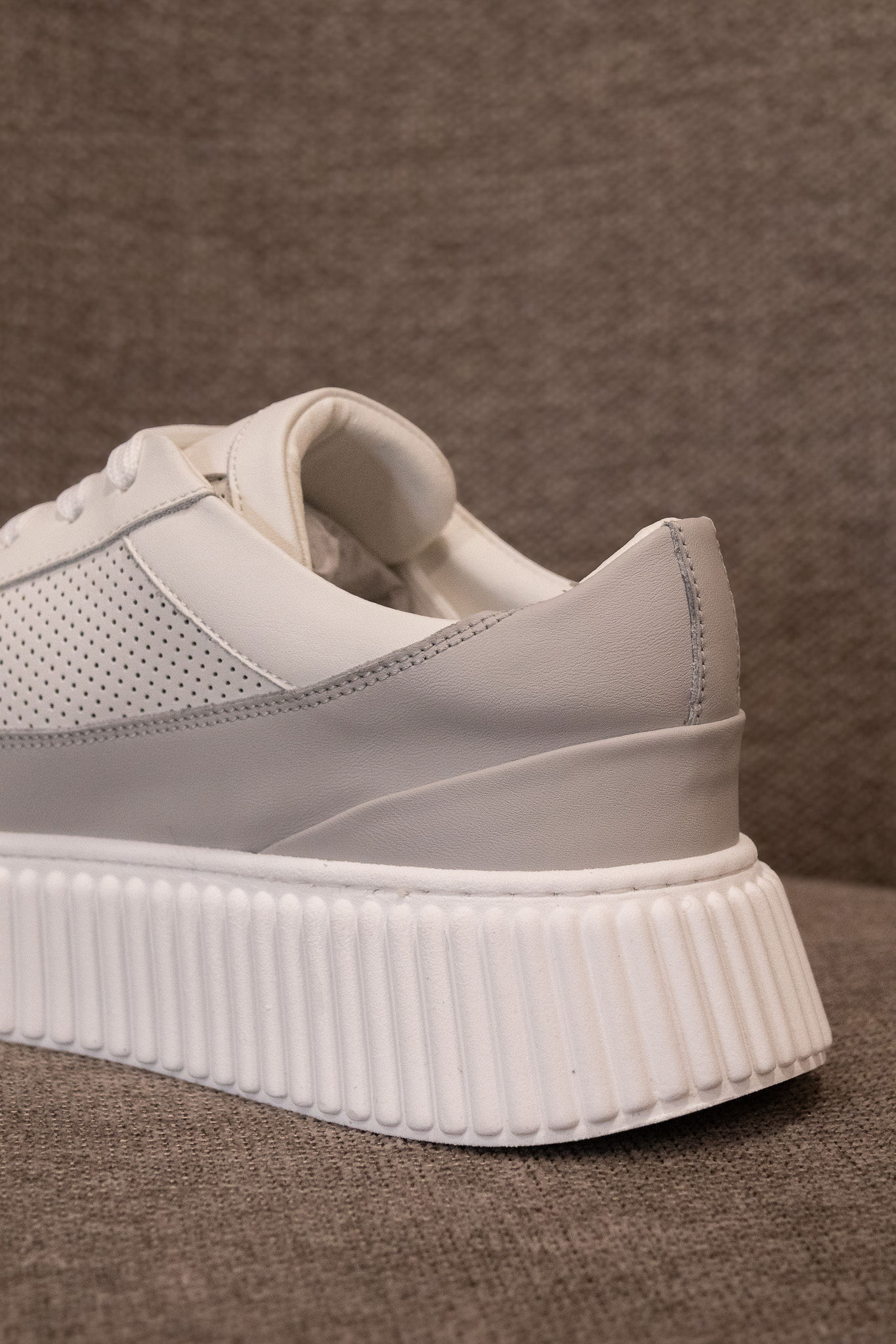 O corpo das sapatilhas é perfurado, um detalhe que acrescenta textura ao design e contribui para maior respirabilidade e conforto durante o uso. A sola robusta proporciona estabilidade e apoio ao caminhar, garantindo conforto prolongado ao longo do dia. O fecho por atacadores permite um ajuste prático e seguro.