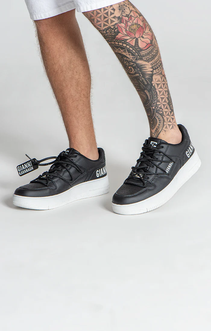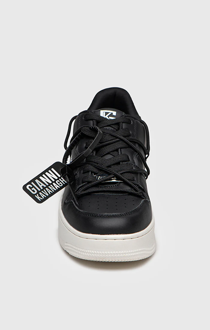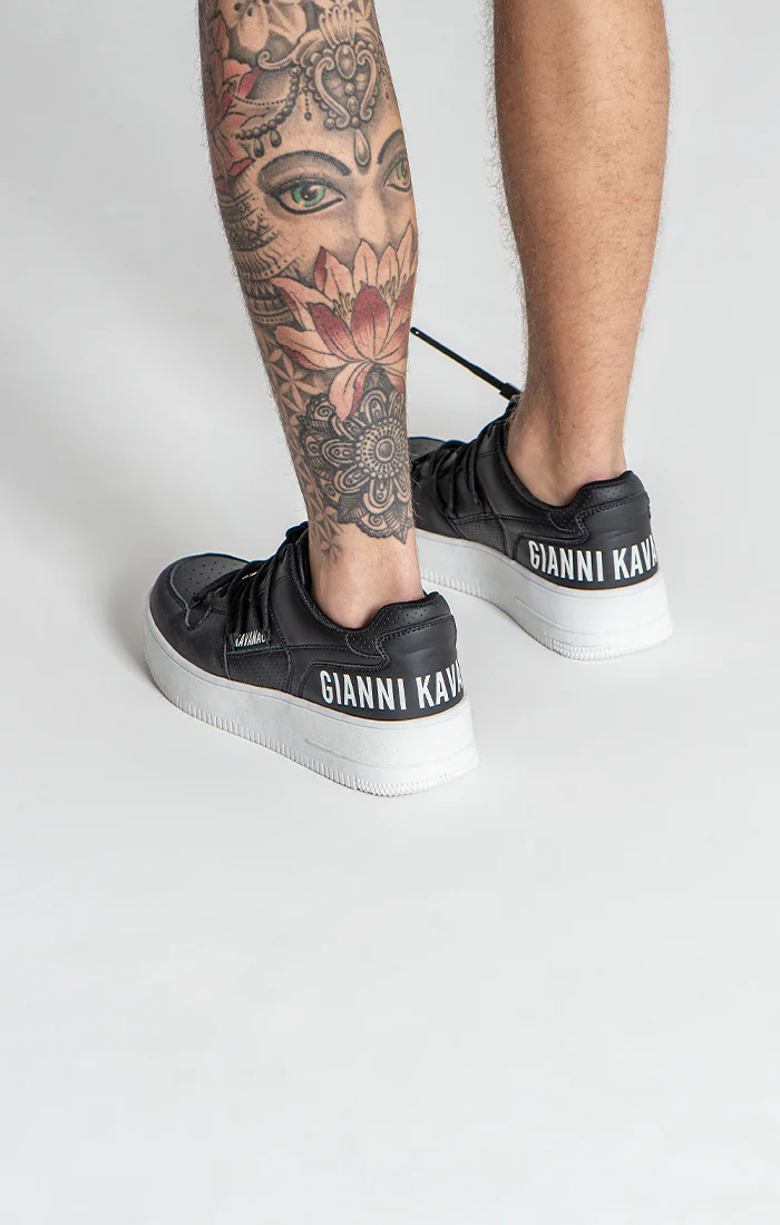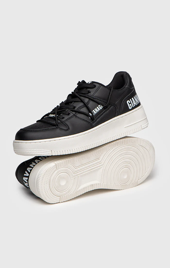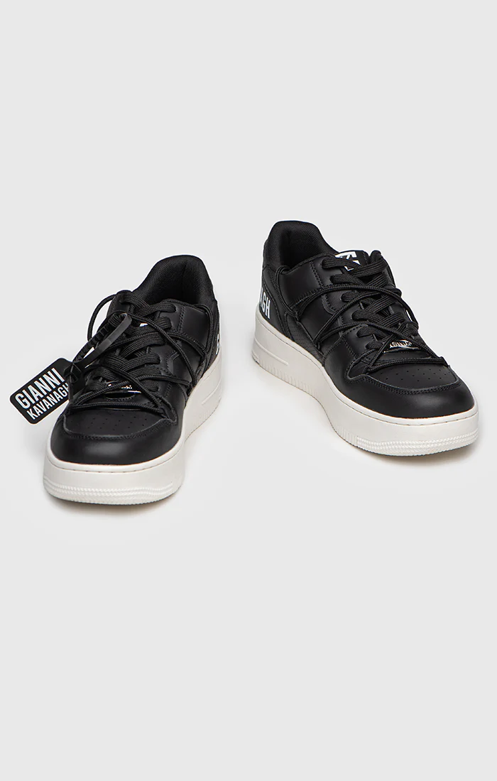 O design destaca-se pela combinação clássica de preto e branco, pela sola robusta e pelo icónico lettering GIANNI KAVANAGH aplicado na lateral — um detalhe marcante que reforça o ADN ousado e contemporâneo da marca. A gáspea texturizada, os atacadores tradicionais e a sola em plataforma criam um visual moderno, versátil e cheio de presença.