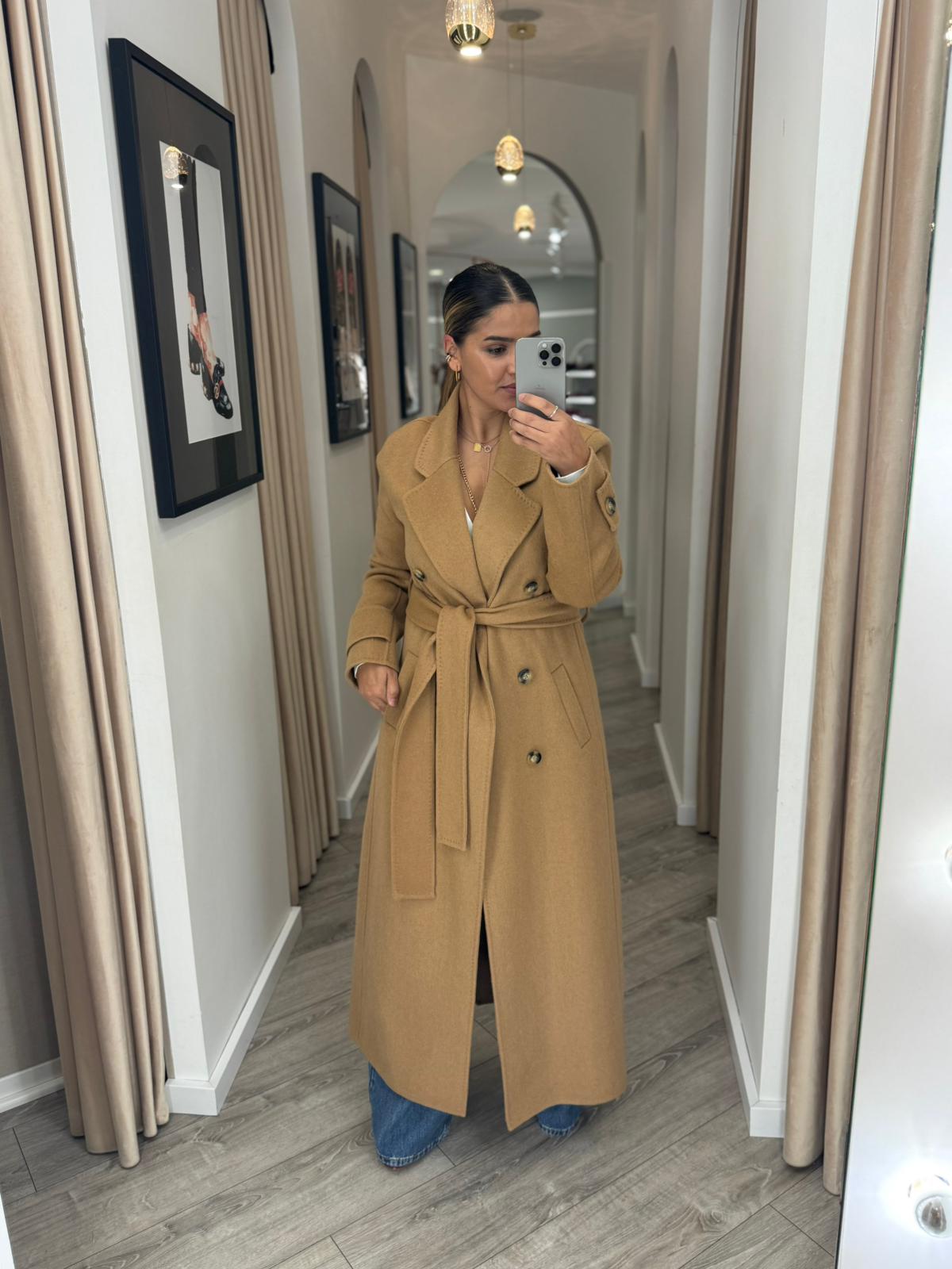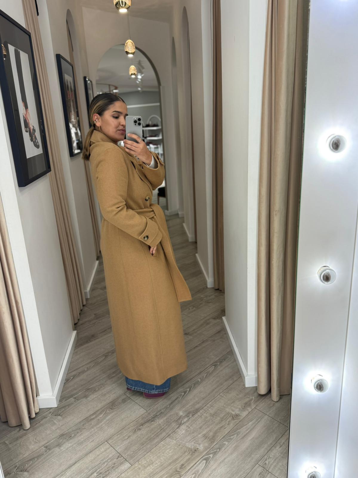 O design apresenta gola de lapela clássica, fecho com botões duplos e cinto ajustável no mesmo tecido, que marca a cintura e valoriza a silhueta. O corte comprido traz modernidade e versatilidade, ideal para looks urbanos ou mais formais.
