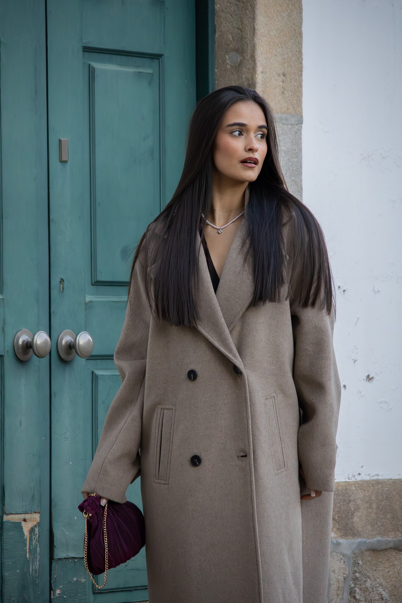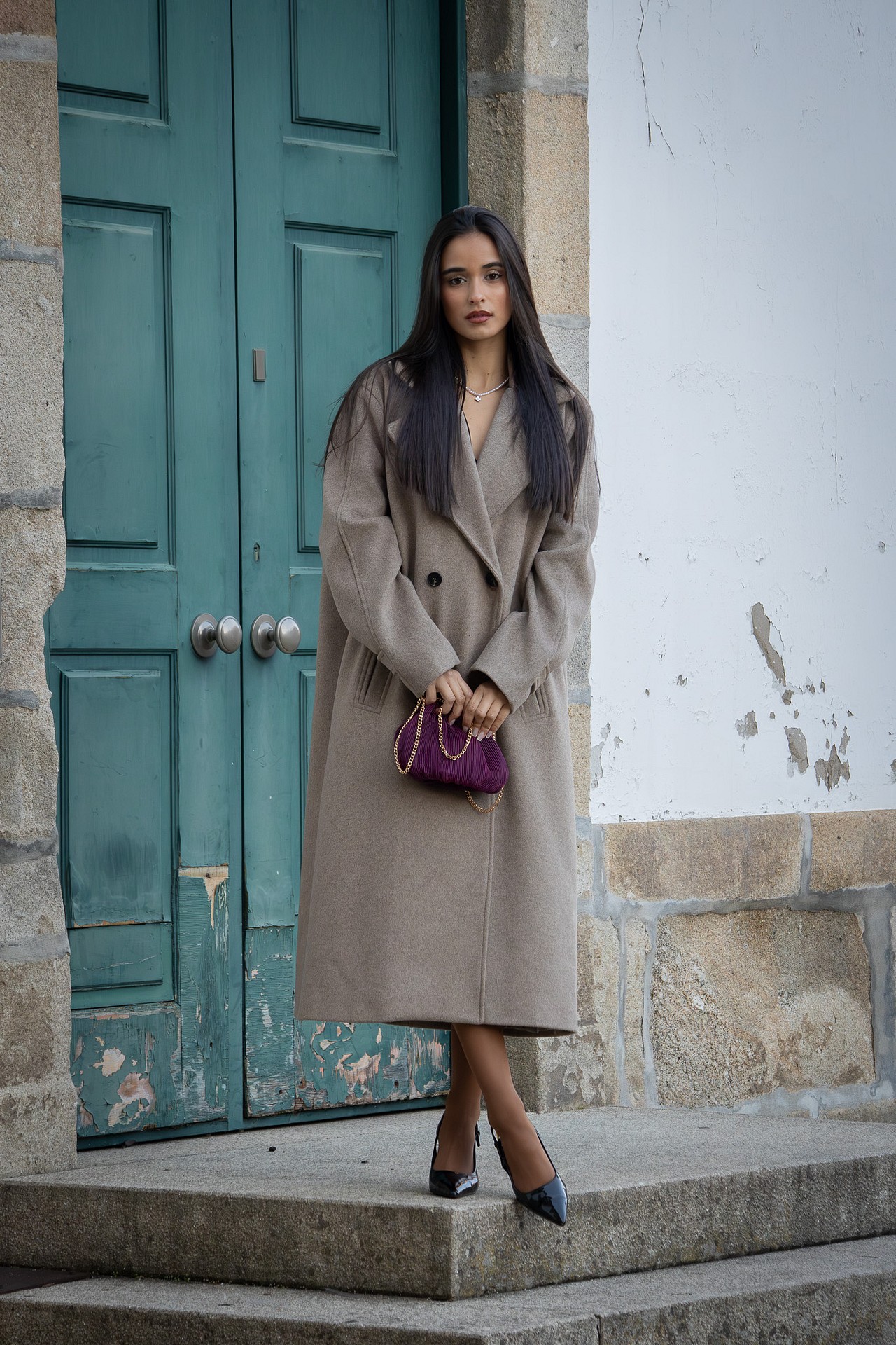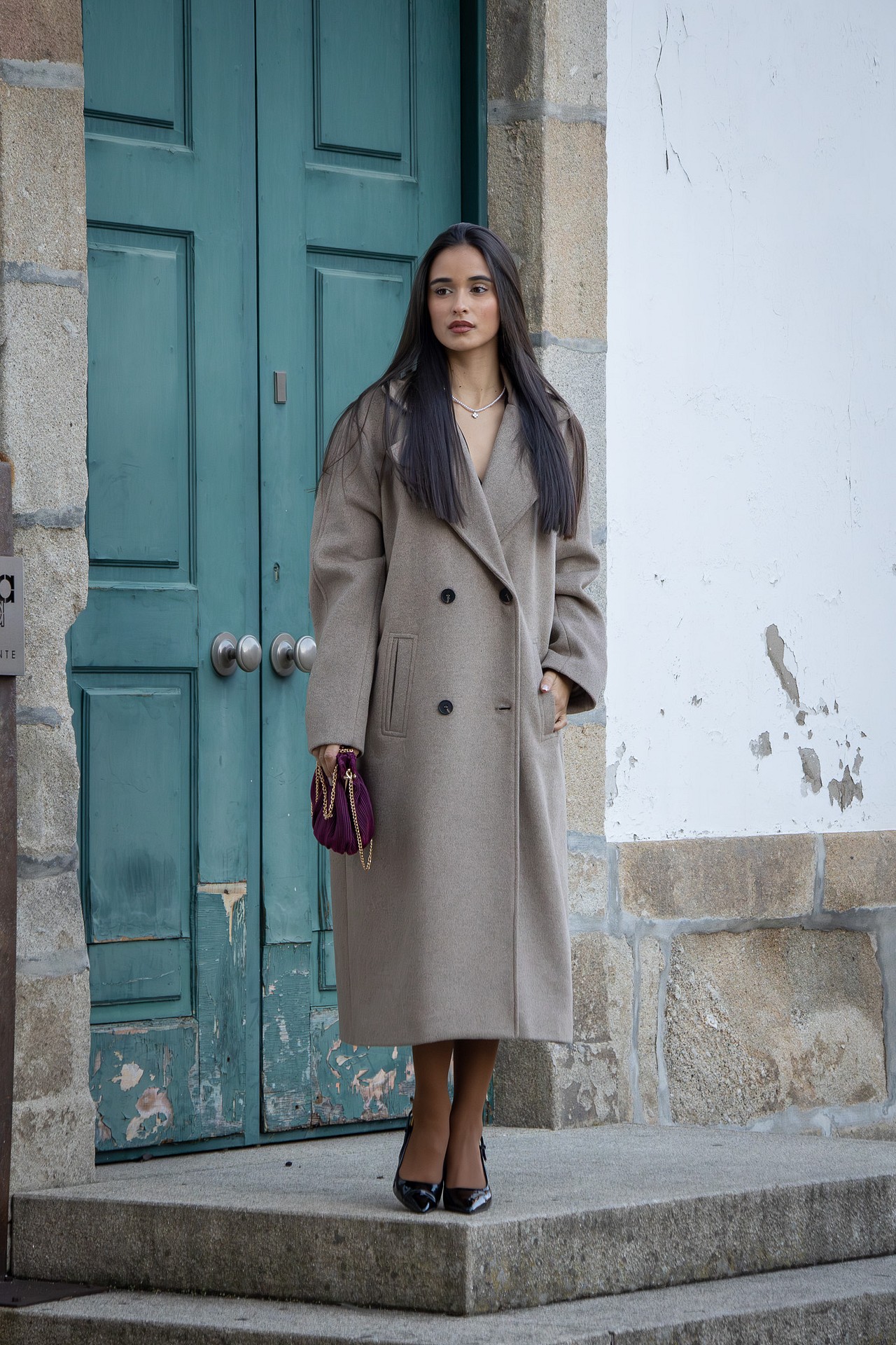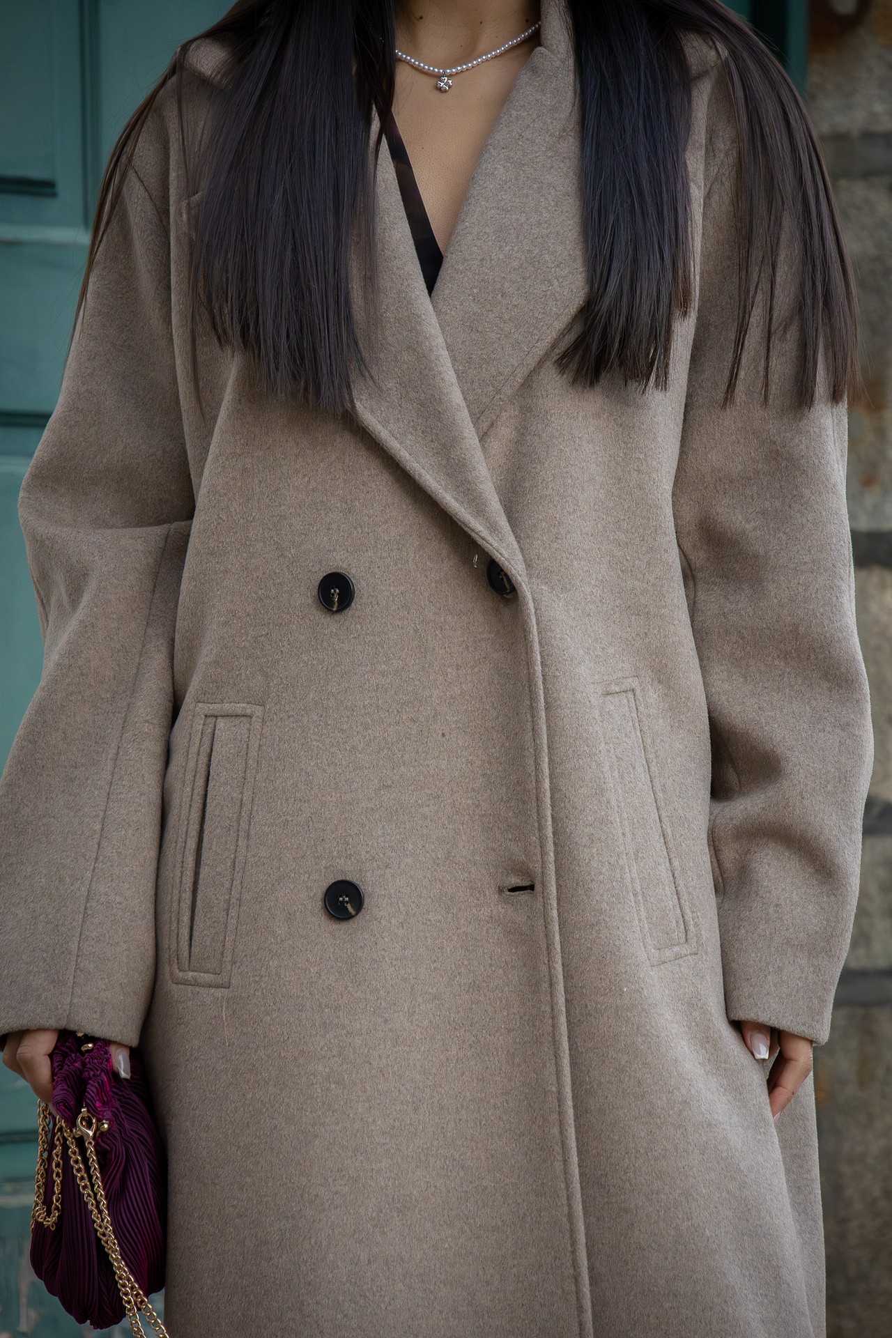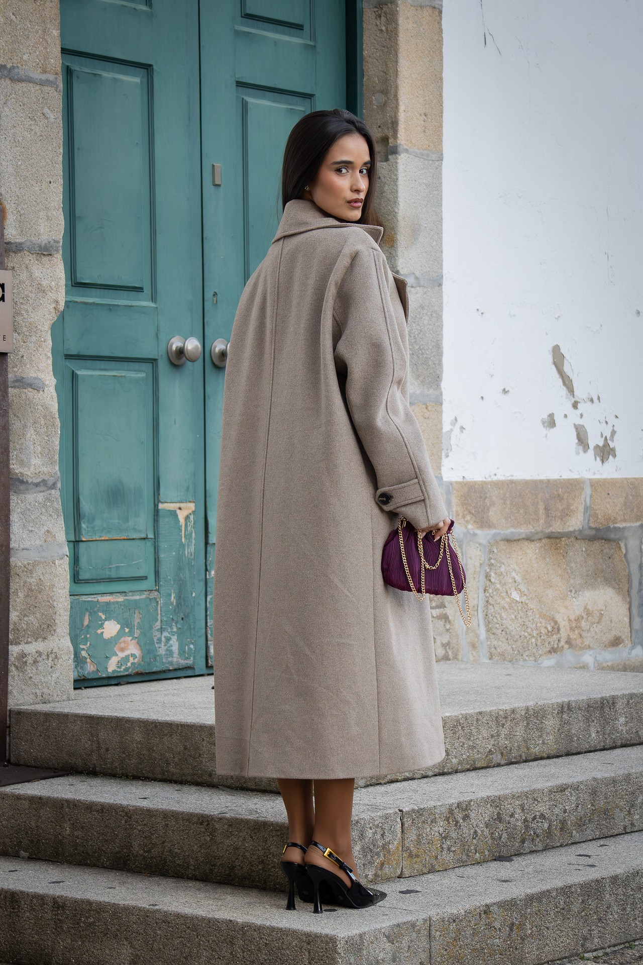 O seu design apresenta lapelas largas, abotoamento frontal duplo e bolsos embutidos, elementos que reforçam a sua estética sofisticada. O corte reto e o comprimento midi tornam esta peça versátil e intemporal, capaz de elevar qualquer coordenado.