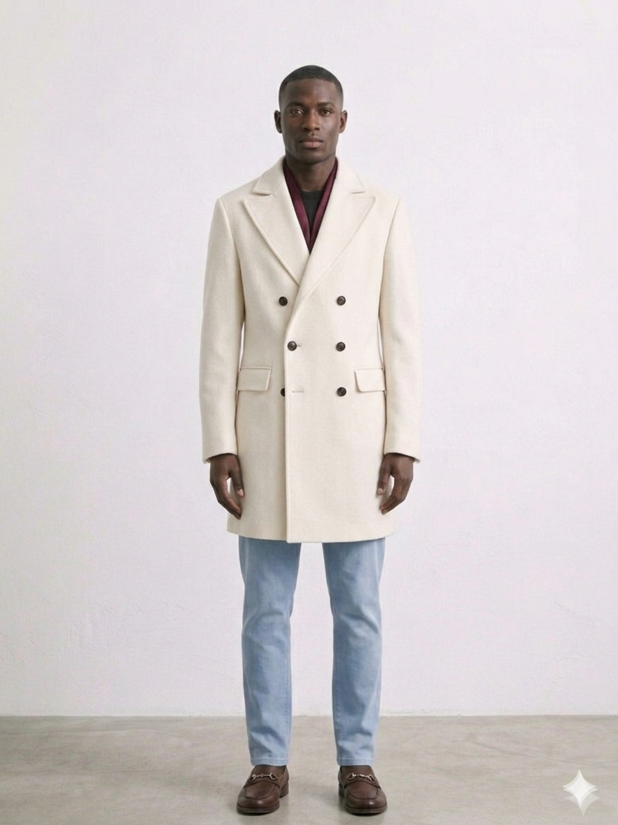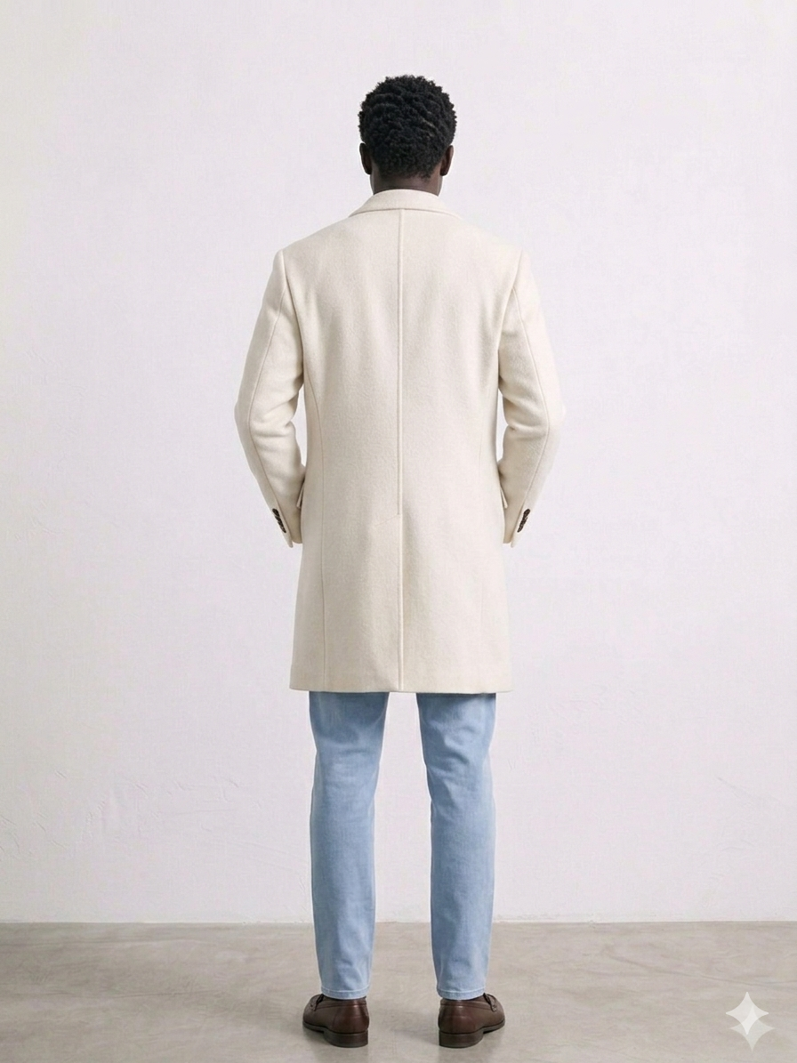 Sobretudo em tom cru de corte elegante, confecionado em tecido estruturado que garante um caimento sofisticado e confortável.