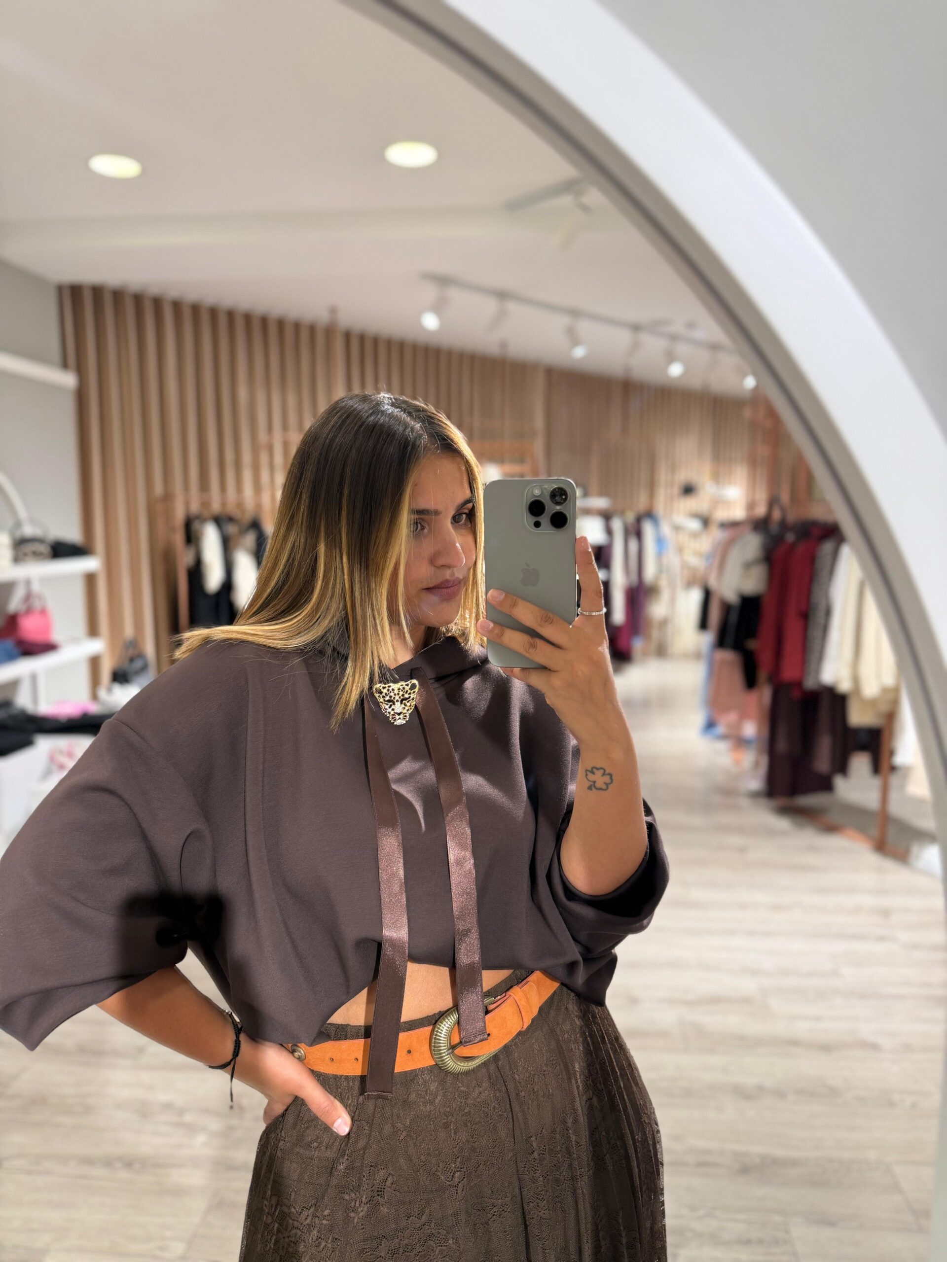 A sweatshirt castanha da marca Renascimento combina conforto e estilo num só design. Confeccionada em 50% poliéster, 46% viscose e 4% elastano, apresenta um toque macio e elástico, perfeito para o dia-a-dia. O capuz confere um ar descontraído, enquanto o detalhe em fita acetinada com aplicação metálica de tigre traz um toque sofisticado e ousado. Ideal para coordenar com calças de ganga ou peças mais elegantes, criando looks modernos e versáteis.