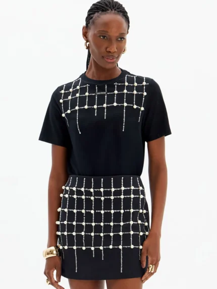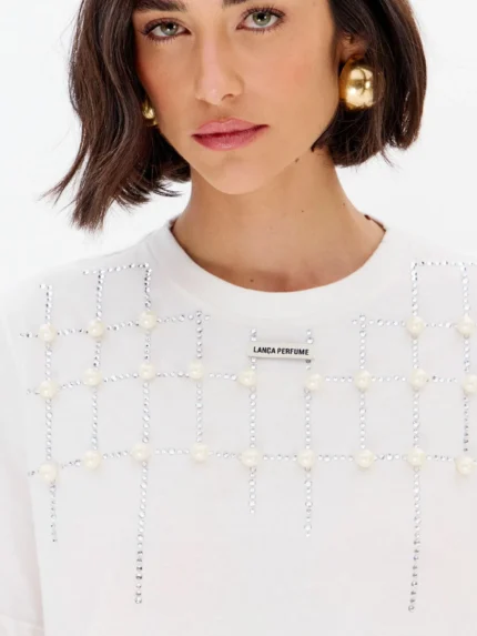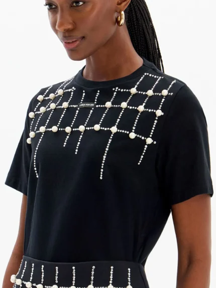 T-SHIRT PRETA COM APLICAÇÃO DE PÉROLAS LANÇA PERFUME