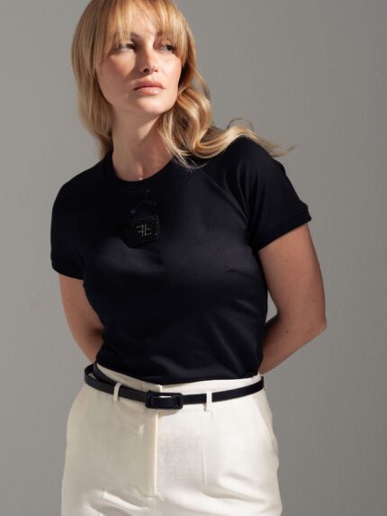 Confeccionada em malha suave com elasticidade — 48% poliéster, 46% viscose e 6% elastano — garante um caimento leve, toque macio e excelente adaptação ao corpo. Uma peça essencial com detalhe diferenciador, perfeita para elevar qualquer coordenado.