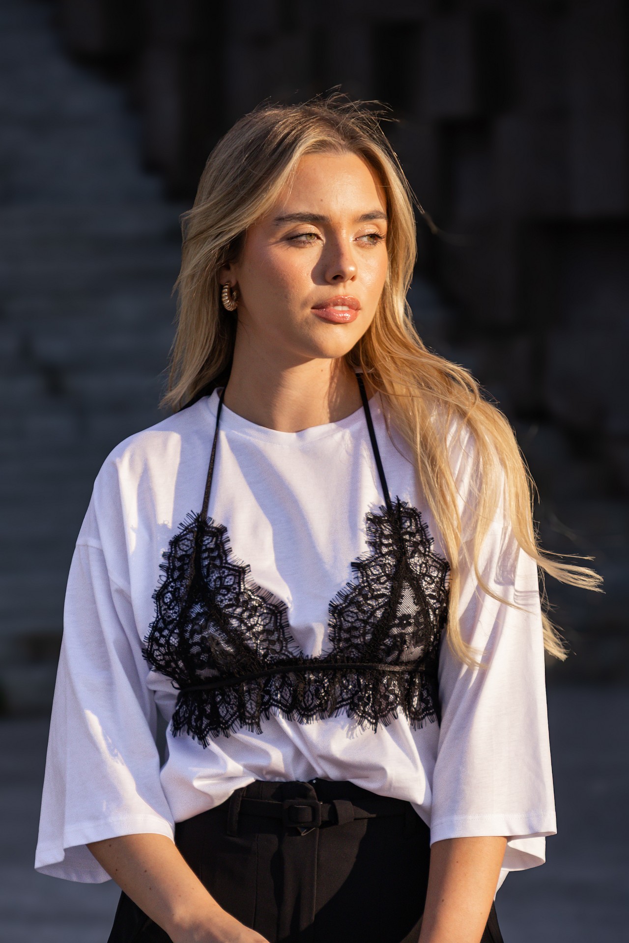 O design destaca-se pelo top em renda preta sobreposto, um detalhe ousado e feminino que transforma uma t-shirt básica numa peça de moda contemporânea. As mangas de corte solto e o tecido fluido tornam-na perfeita para um uso confortável e cheio de estilo.