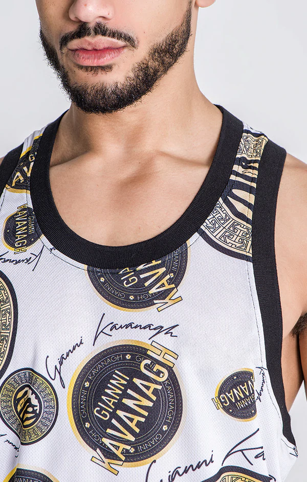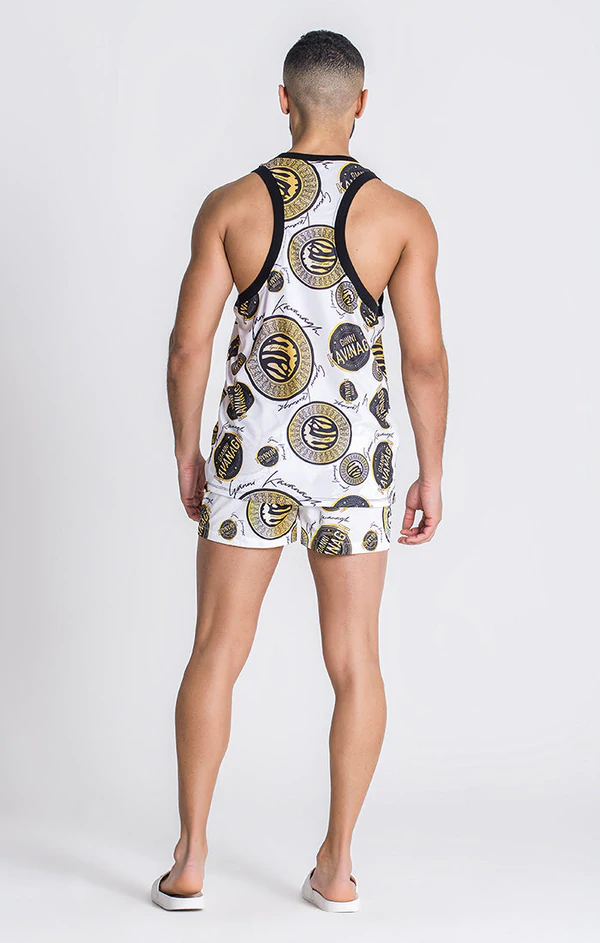 Com estampa integral de medalhões e assinaturas GK em tons de dourado e preto, o modelo reflete a identidade ousada e luxuosa da marca. O corte justo e o acabamento contrastante nas alças reforçam o caráter moderno e desportivo da peça.
