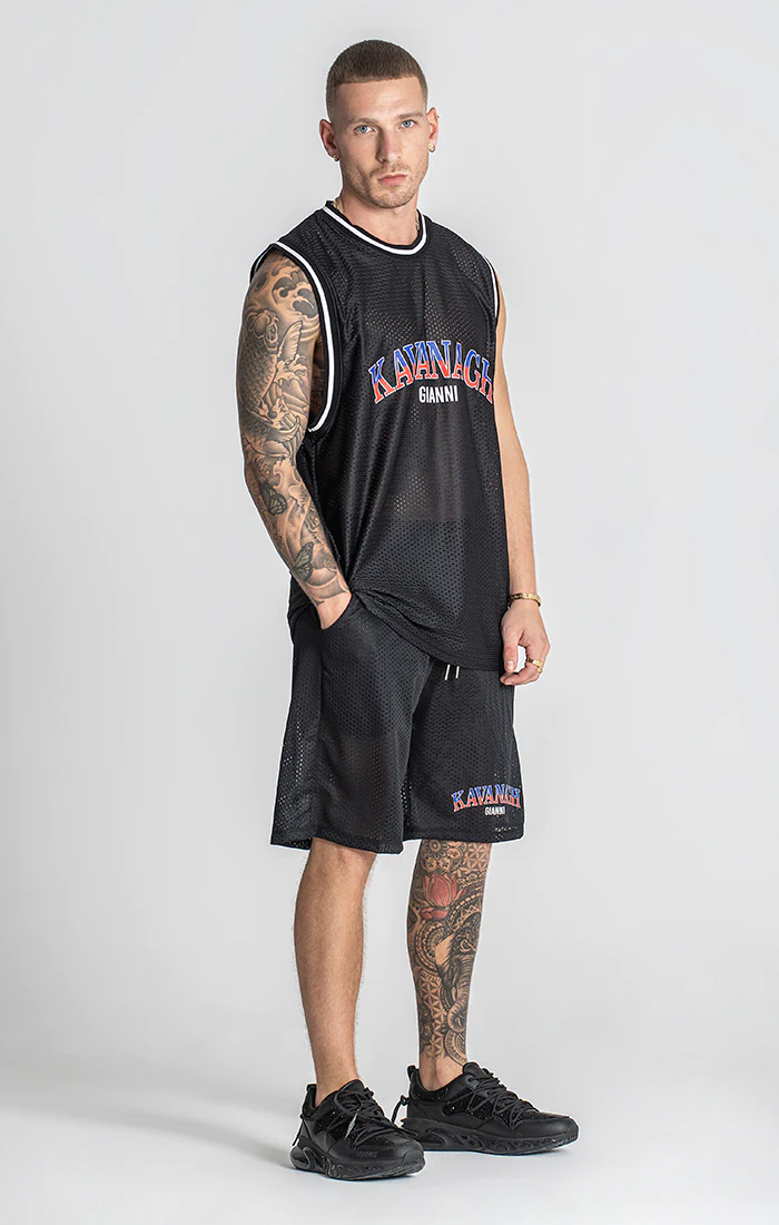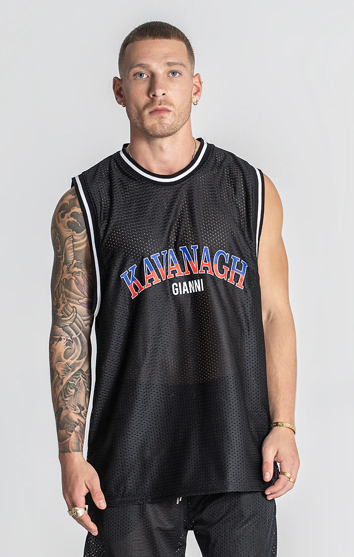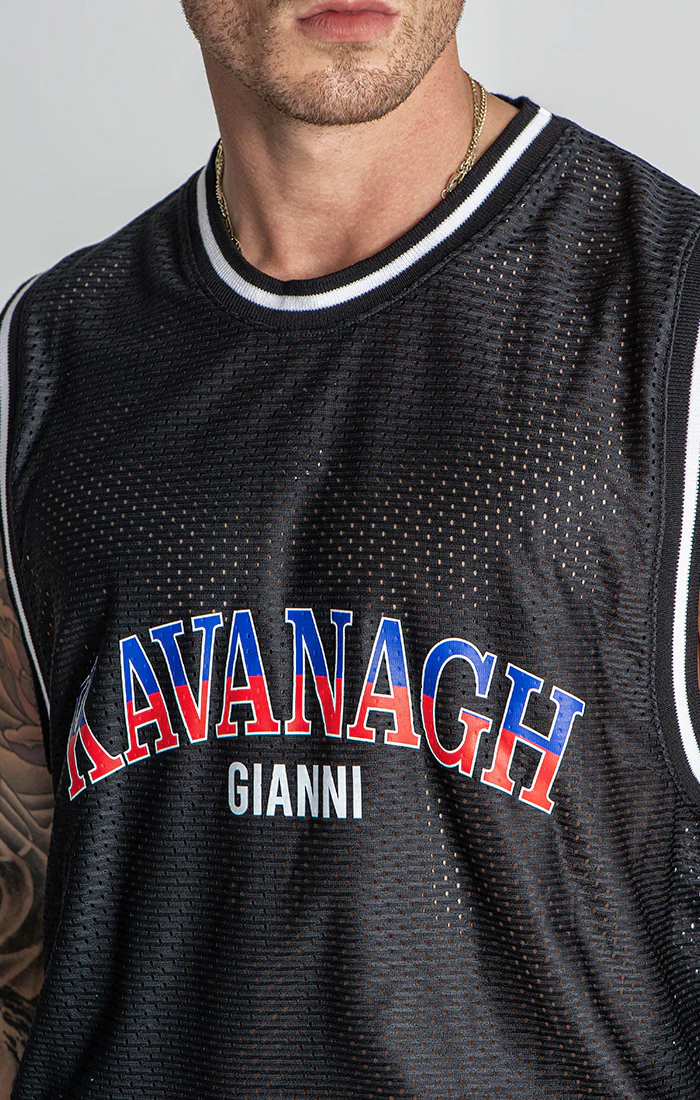 O modelo destaca-se pelo logótipo “KAVANAGH GIANNI” em tons vibrantes de azul e vermelho, que contrasta com o fundo em rede preta, evocando a estética das camisolas de basquetebol.