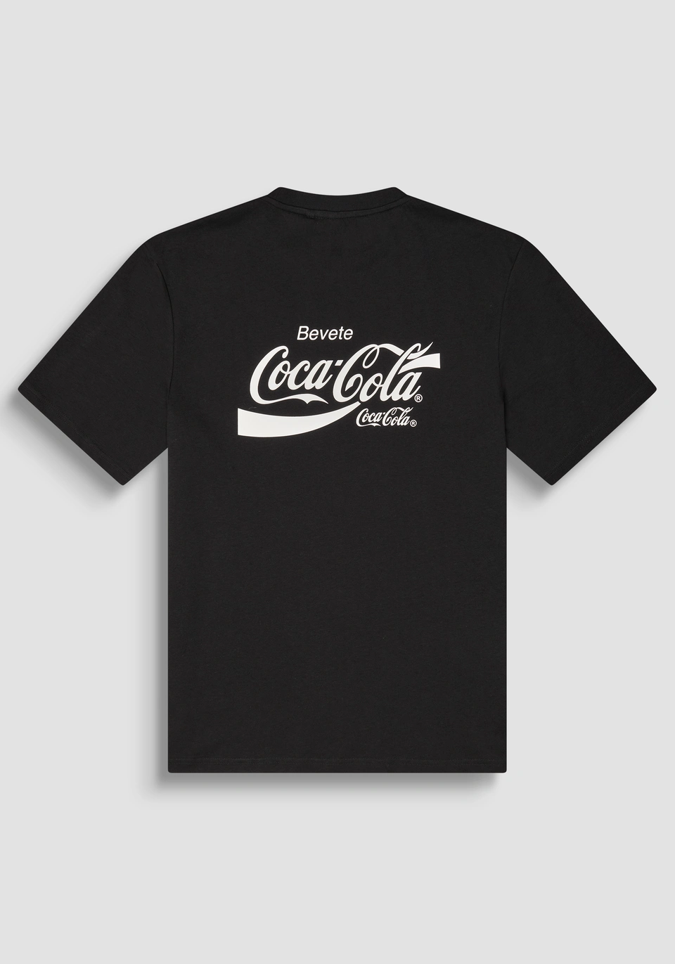 Na frente, destaca-se a estampa gráfica com diferentes versões internacionais do logótipo Coca-Cola, conferindo atitude e autenticidade. Nas costas, surge o clássico slogan “Bevete Coca-Cola”, que reforça a inspiração icónica desta parceria.
