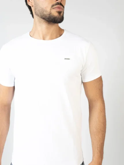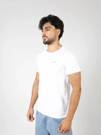 T-shirt produzida com algodão e elastano, para garantir máximo conforto, liberdade de movimentos, e durabilidade de cor após as lavagens. A versatilidade desta matéria prima garante a liberdade de movimentos ideal e a sua textura transmite a elegância aliada ao conforto que necessitas para todas as ocasiões do teu dia. O nosso modelo tem 185 cm de altura, pesa 78 quilos e usa um tamanho M.