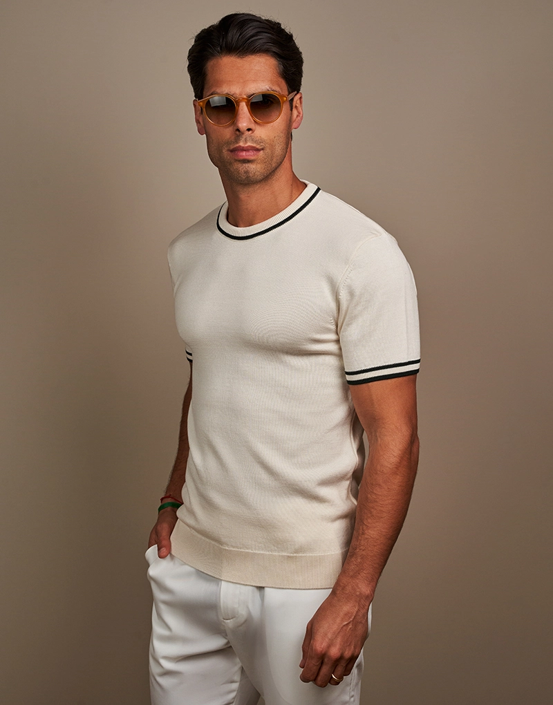 Apresenta um corte ajustado ao corpo que valoriza a silhueta masculina de forma elegante e moderna. O destaque vai para os acabamentos canelados na gola e mangas com riscas contrastantes, que criam um efeito bicolor subtil e diferenciador.